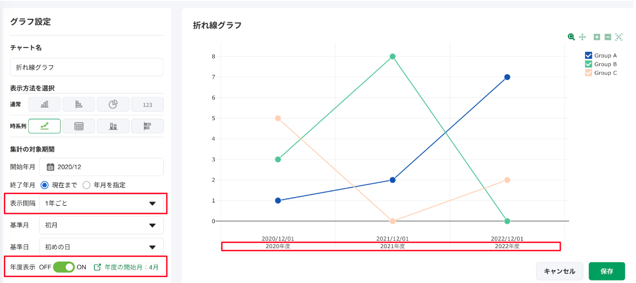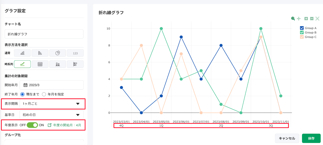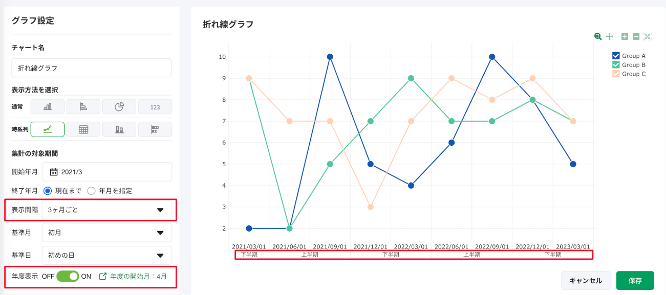 [年度表示]を[ON]にすることで、時系列グラフにおいて、Q・半期・年度の表示を追加することが可能です。