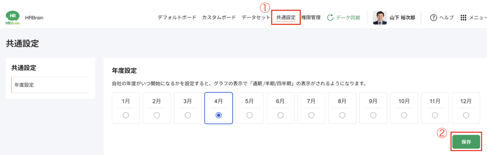 ②自社の年度の開始月を選択肢、[保存]をクリックする