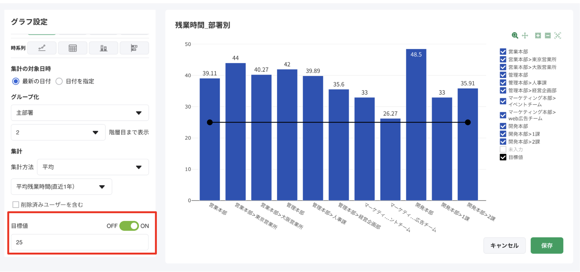 [目標値]を[ON]にし値を設定することで、グラフに目標値を表示することができます。