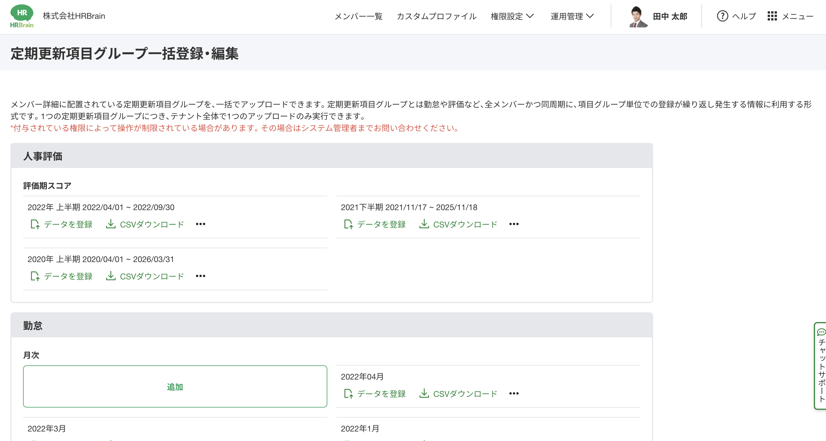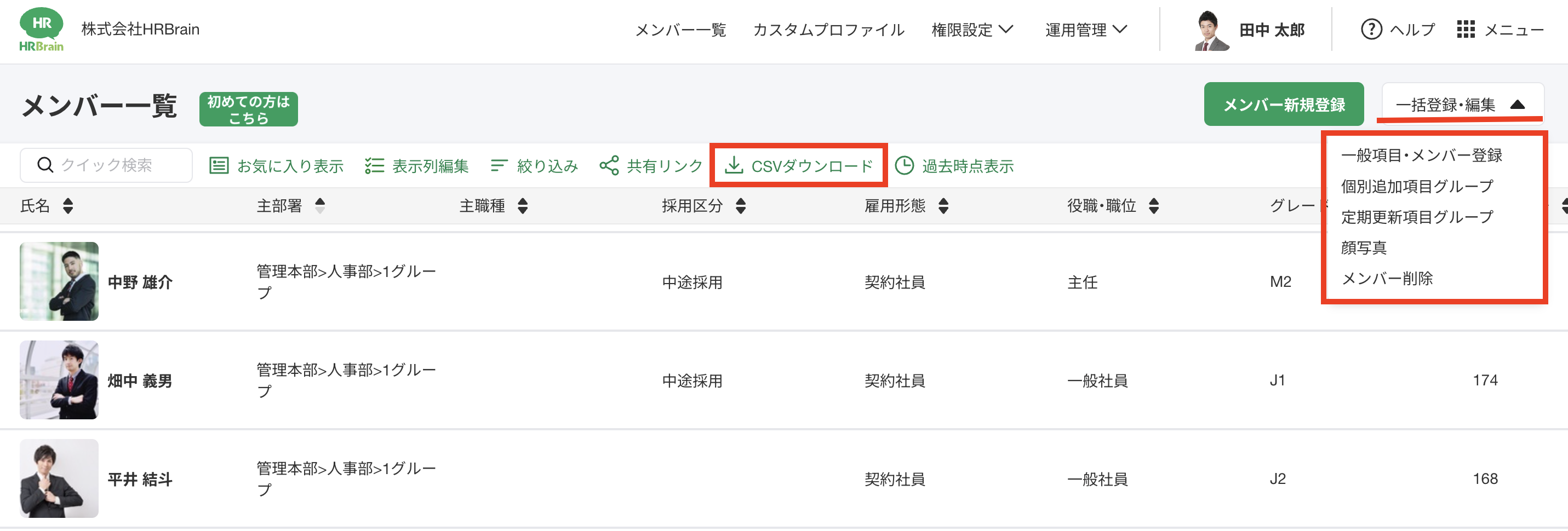 [メンバー一覧] > [一括登録・編集]から、該当の項目を選択してダウンロードをクリック