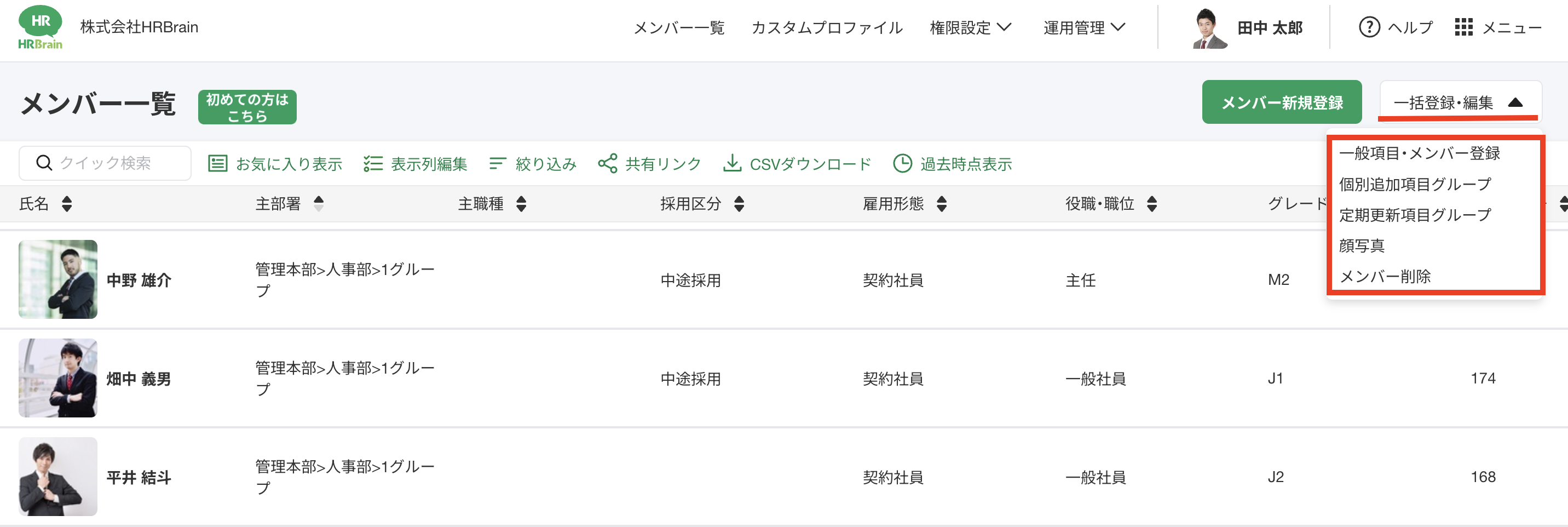 メンバー情報一括操作権限を持つメンバーは、下記画像の赤枠部分が表示されます。