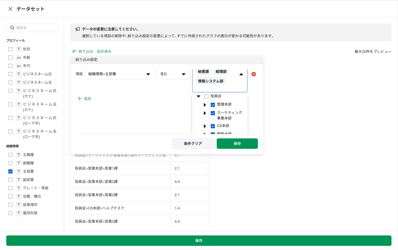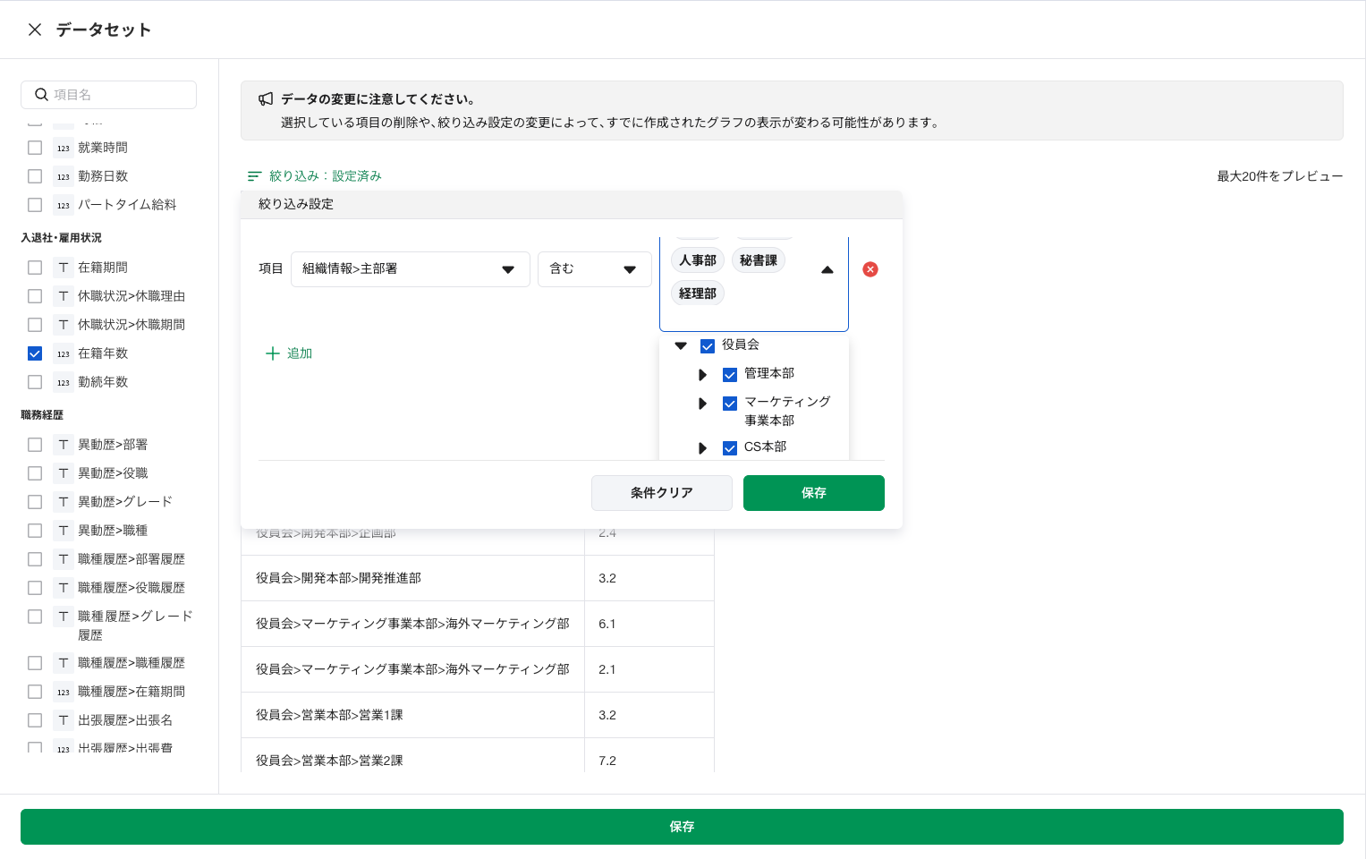 絞り込み:在籍中、主部署(任意の部署を選択)
