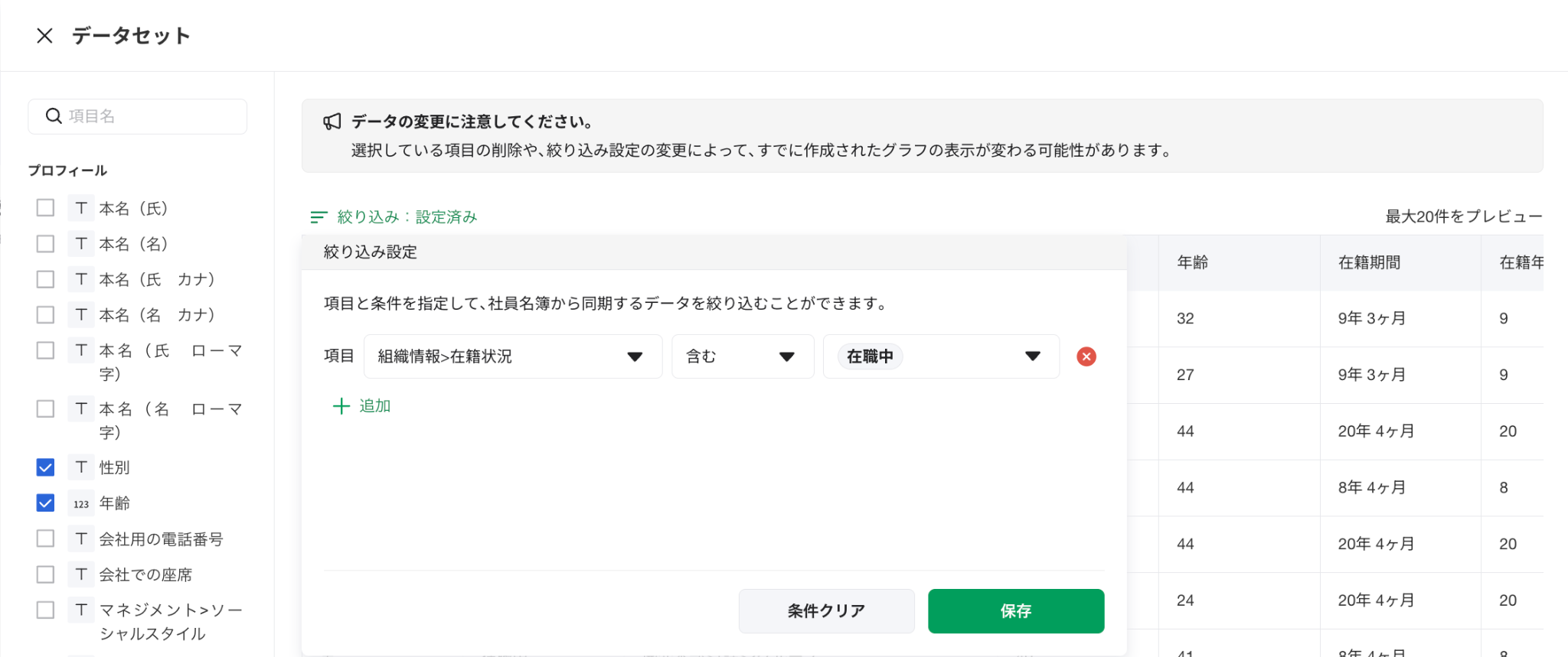 絞り込み:[在籍状況]で退職済みを[含まない]にして選択