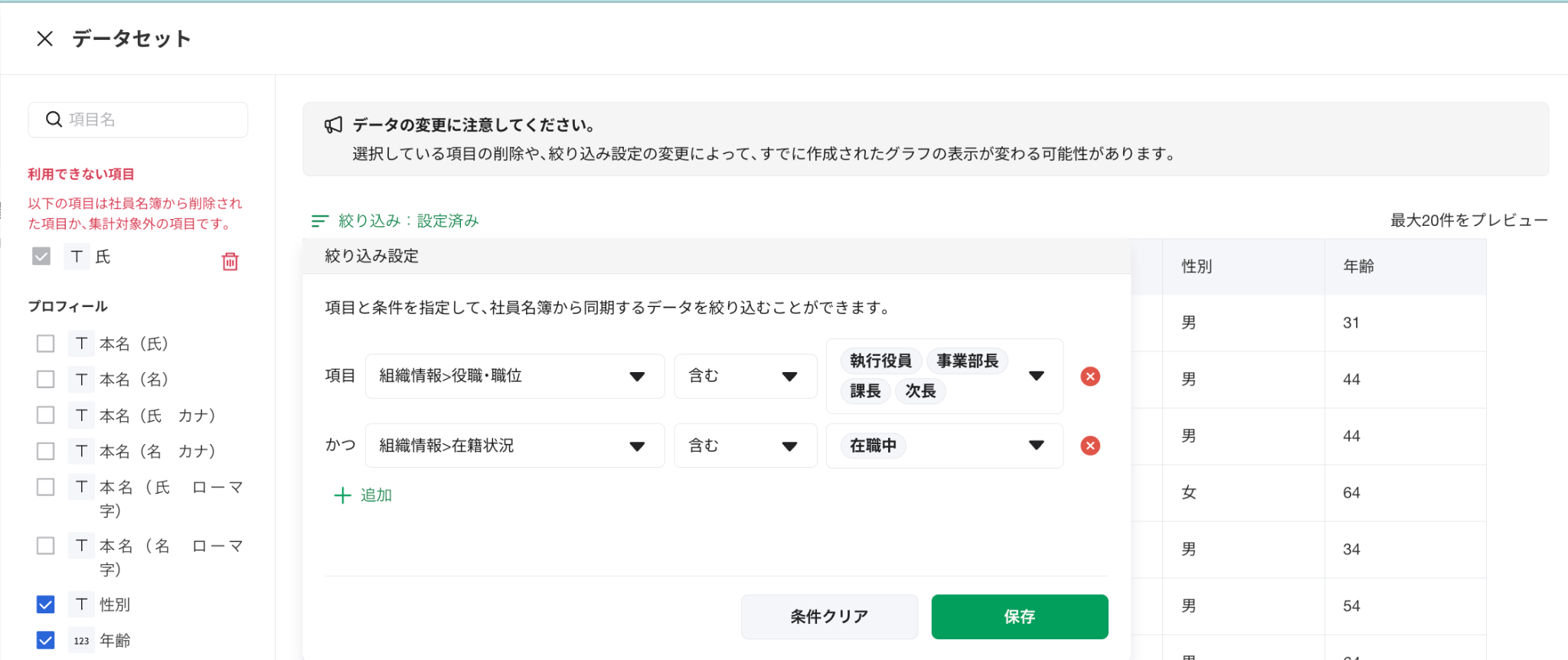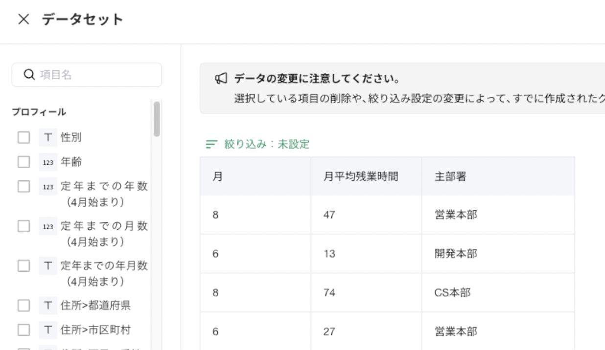 絞り込み:退職済み、(部署別で出す場合、部署別に絞り込んだデータセットを作成)