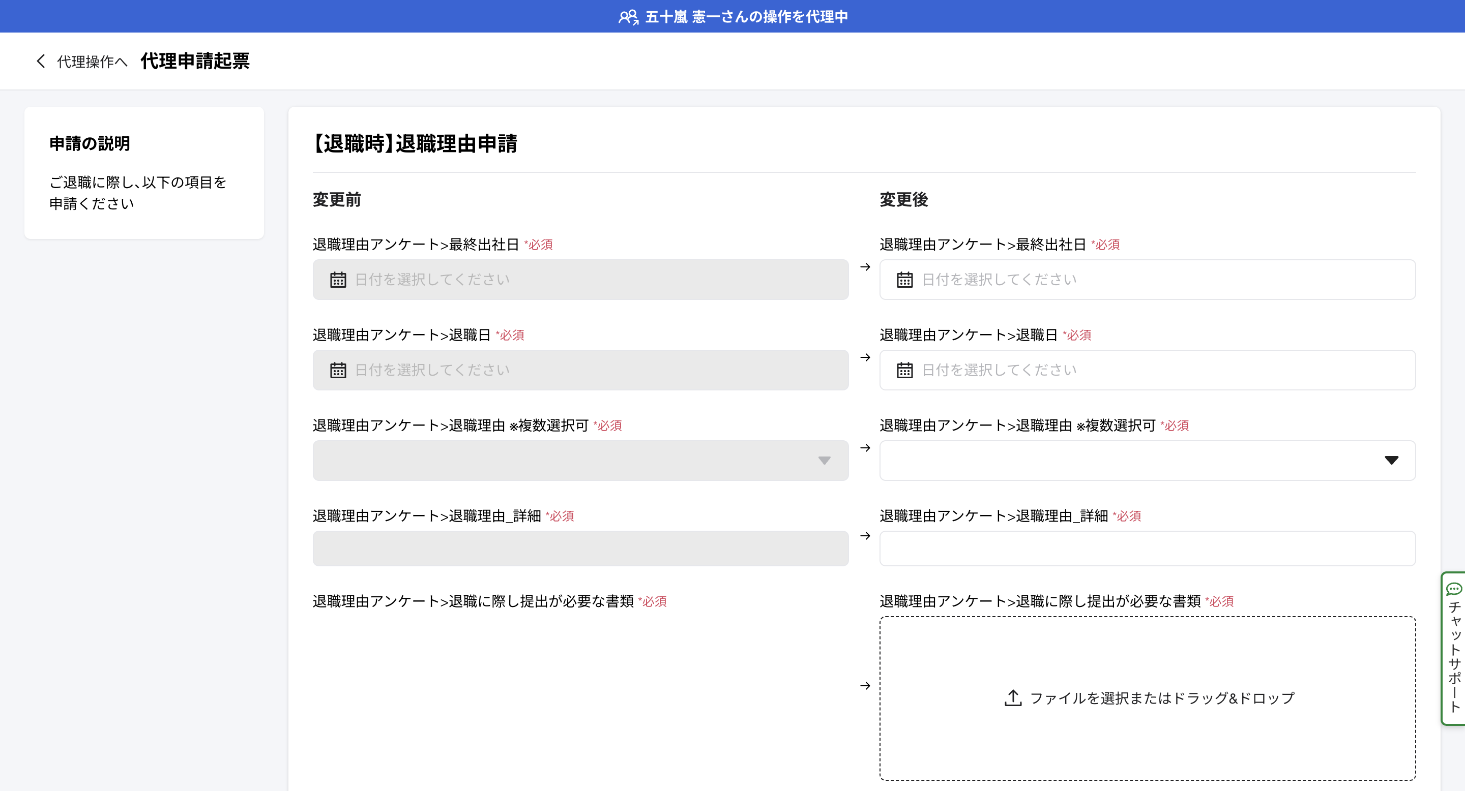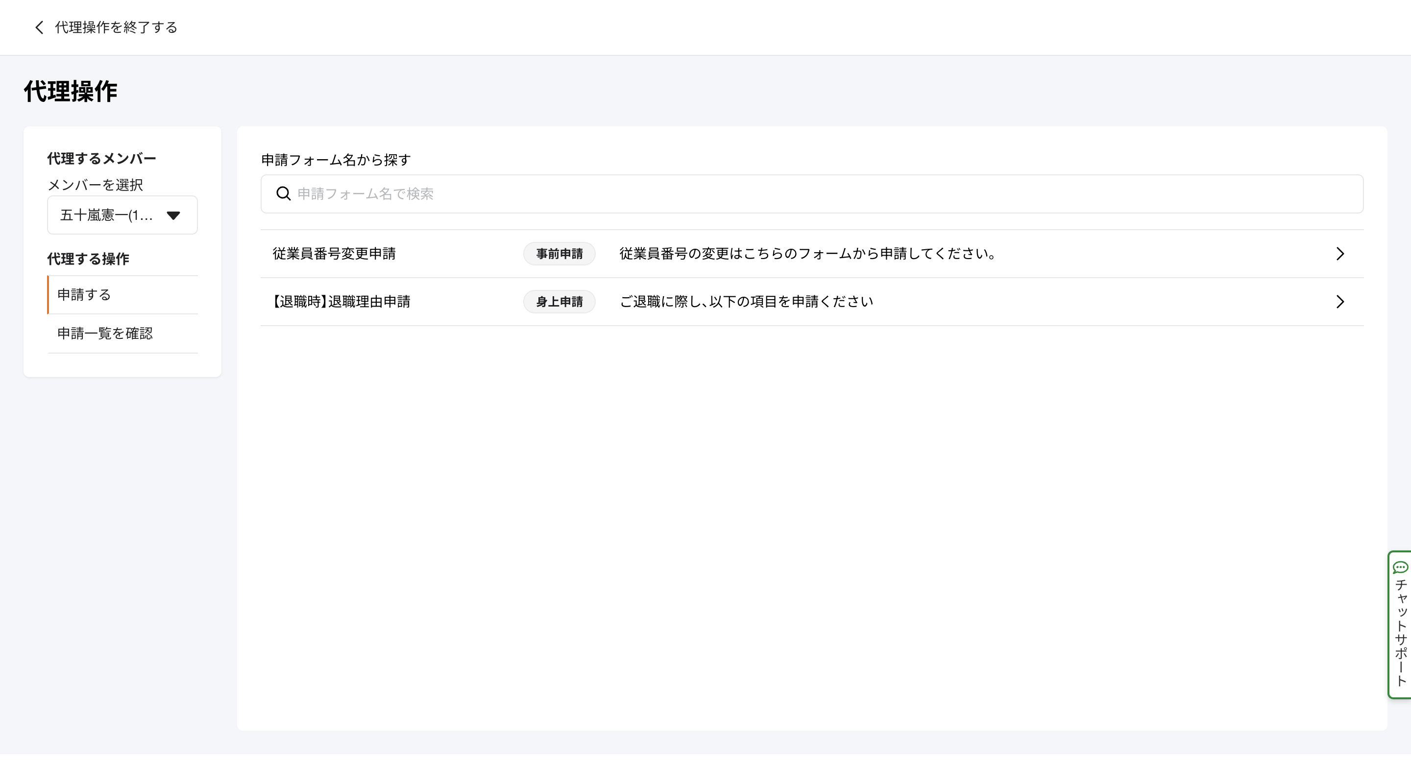 「代理するメンバー」「代理する操作」「申請フォーム」を選択し該当箇所を記入した上で申請をしてください。