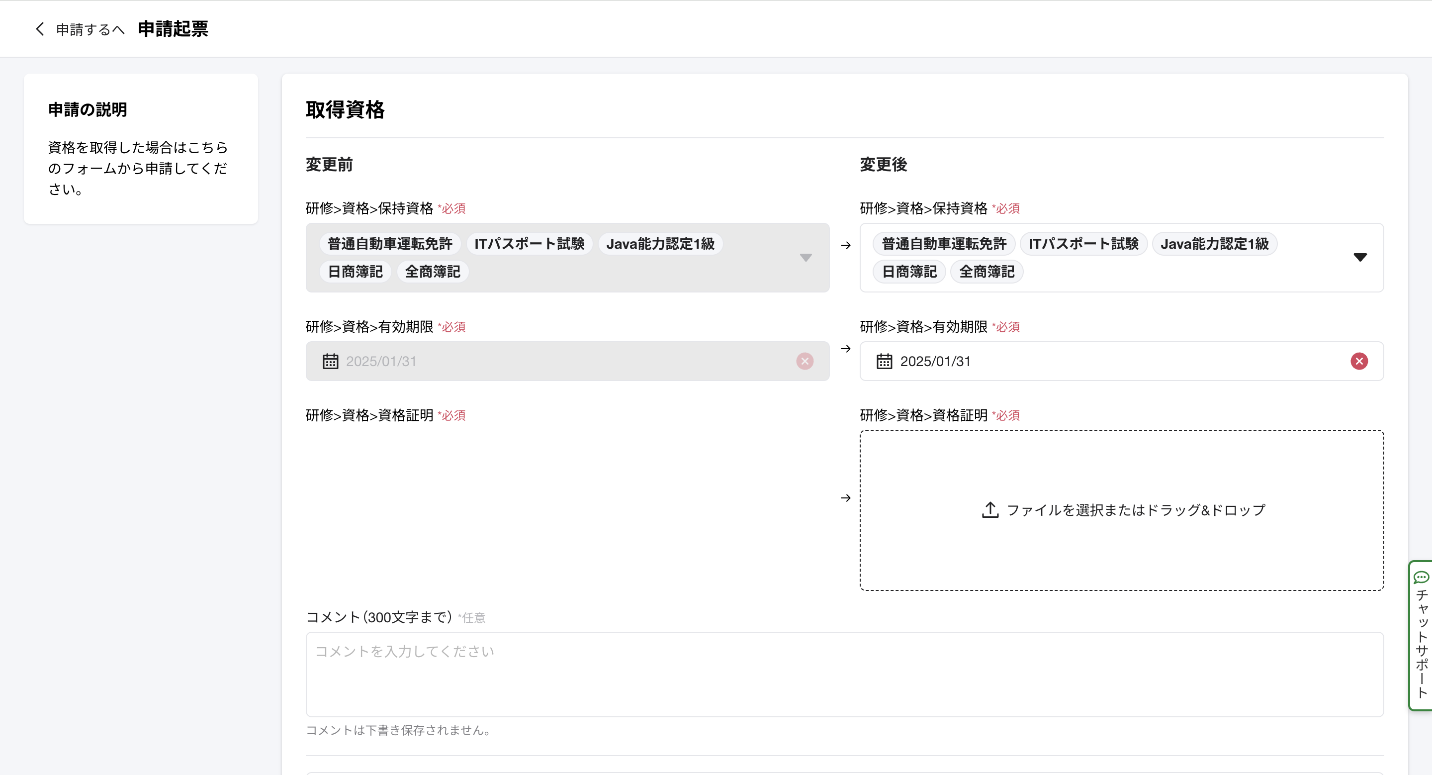 - ワークフロー機能で申請を上げてもらうかたちで、研修受講、資格取得の情報が収集できる
