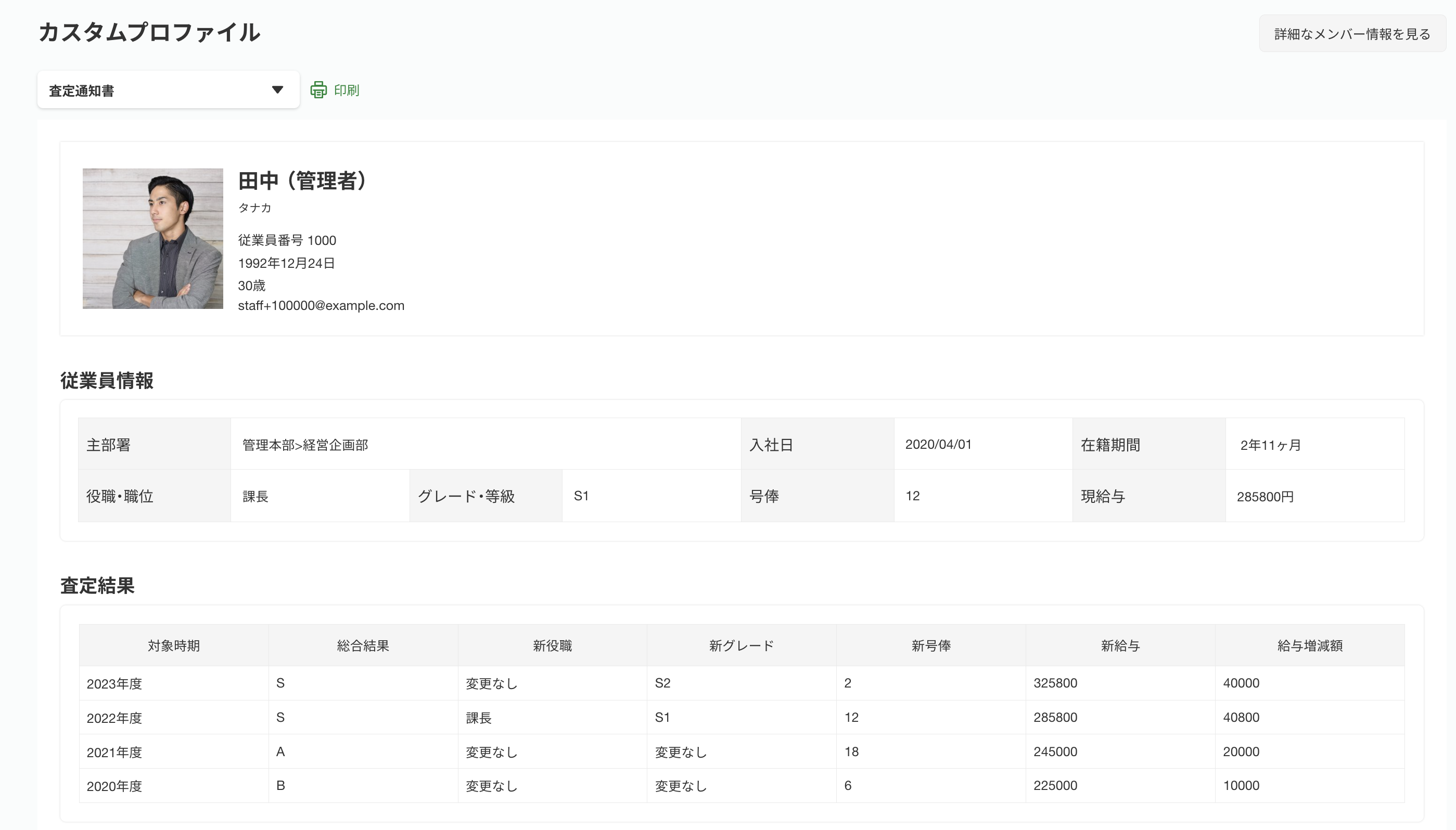査定通知の項目にデータを登録し、従業員にカスタムプロファイルを確認するように案内をおこないます。