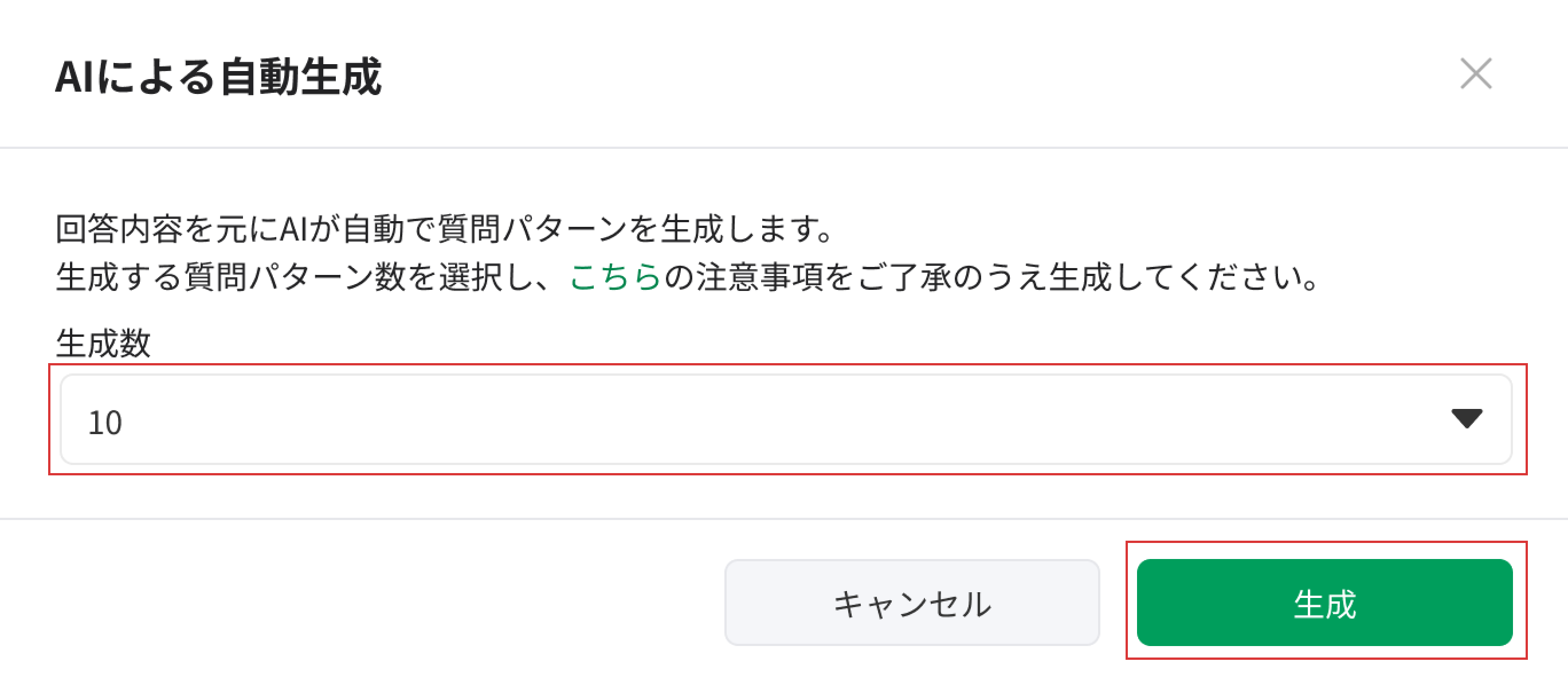 ③自動生成したい質問パターン数(5/10/15)を選択し、[生成]をクリック