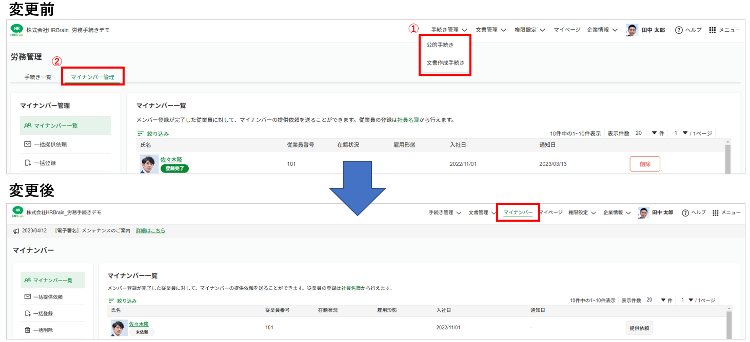 変更前:[手続き管理] > [公的手続き] > [マイナンバー]