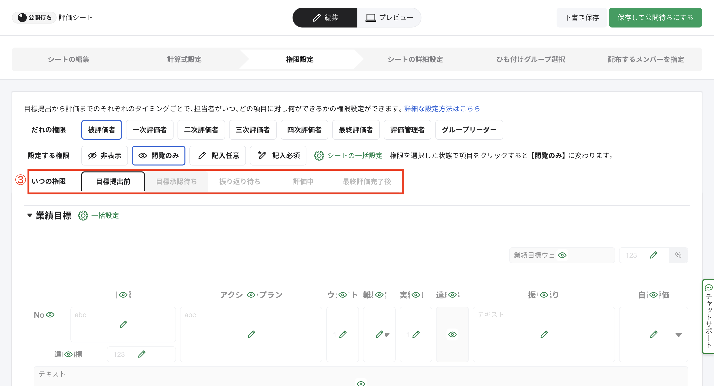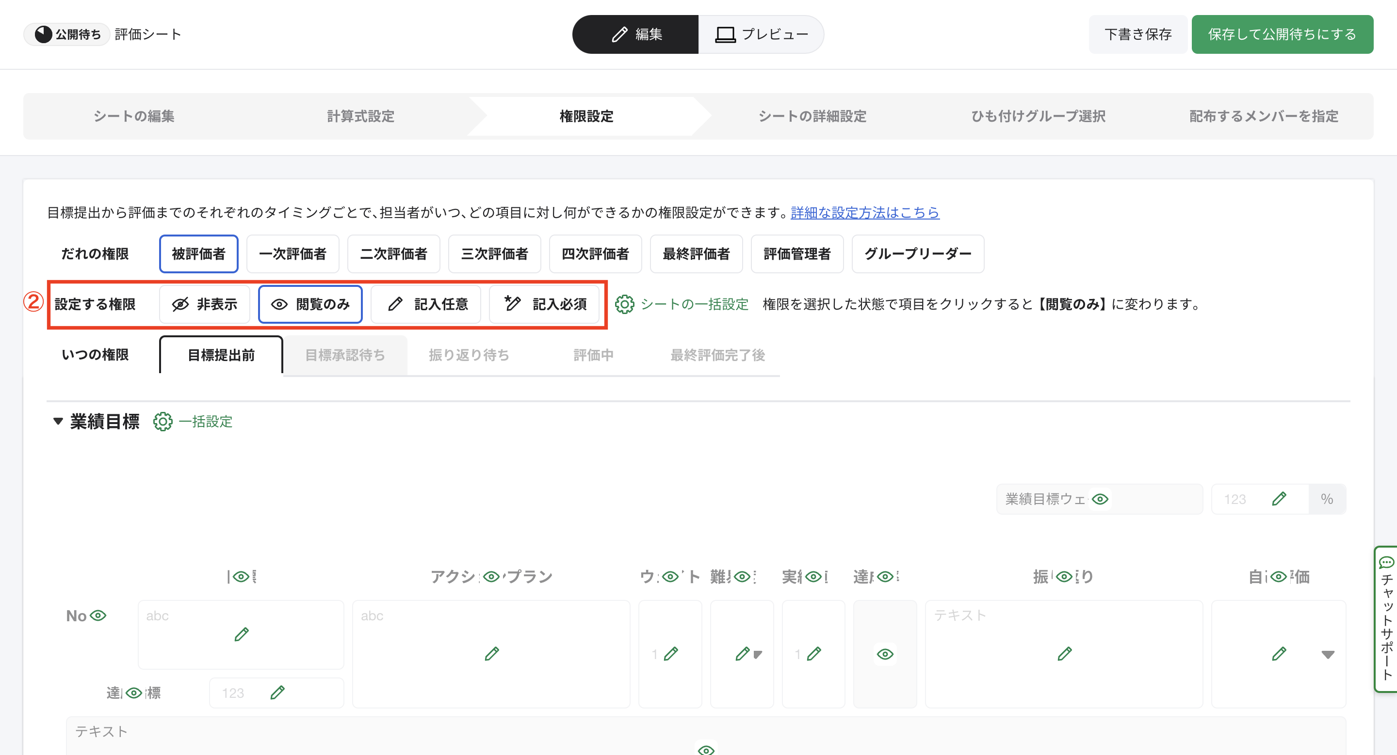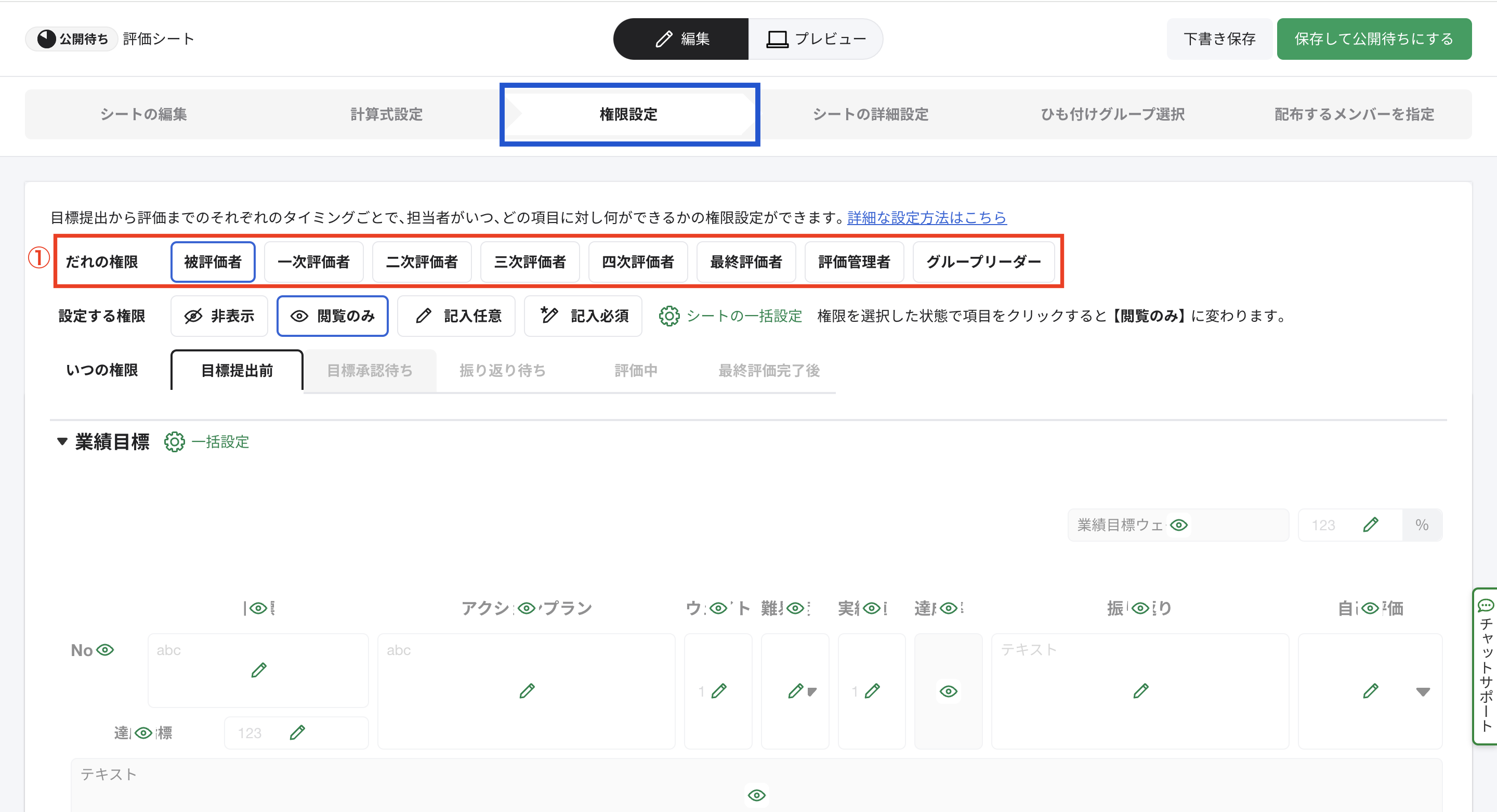 ①[権限設定]にて、被評価者、一次〜最終評価者、評価管理者、グループリーダーの誰の立場での権限を設定するか選択します。