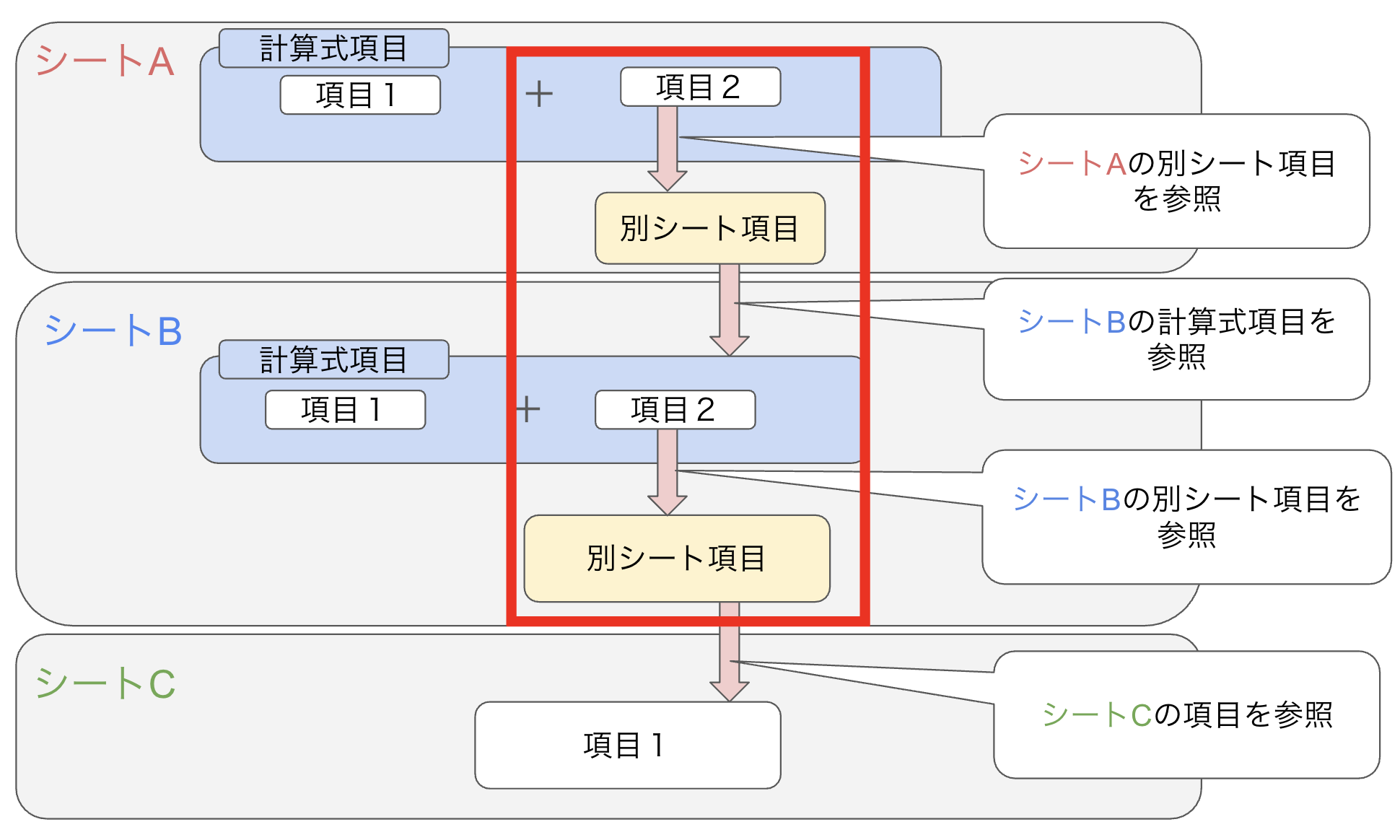 計算式で別シート項目を参照できますが、間接的に他のシートの別シート項目を参照している場合があります。