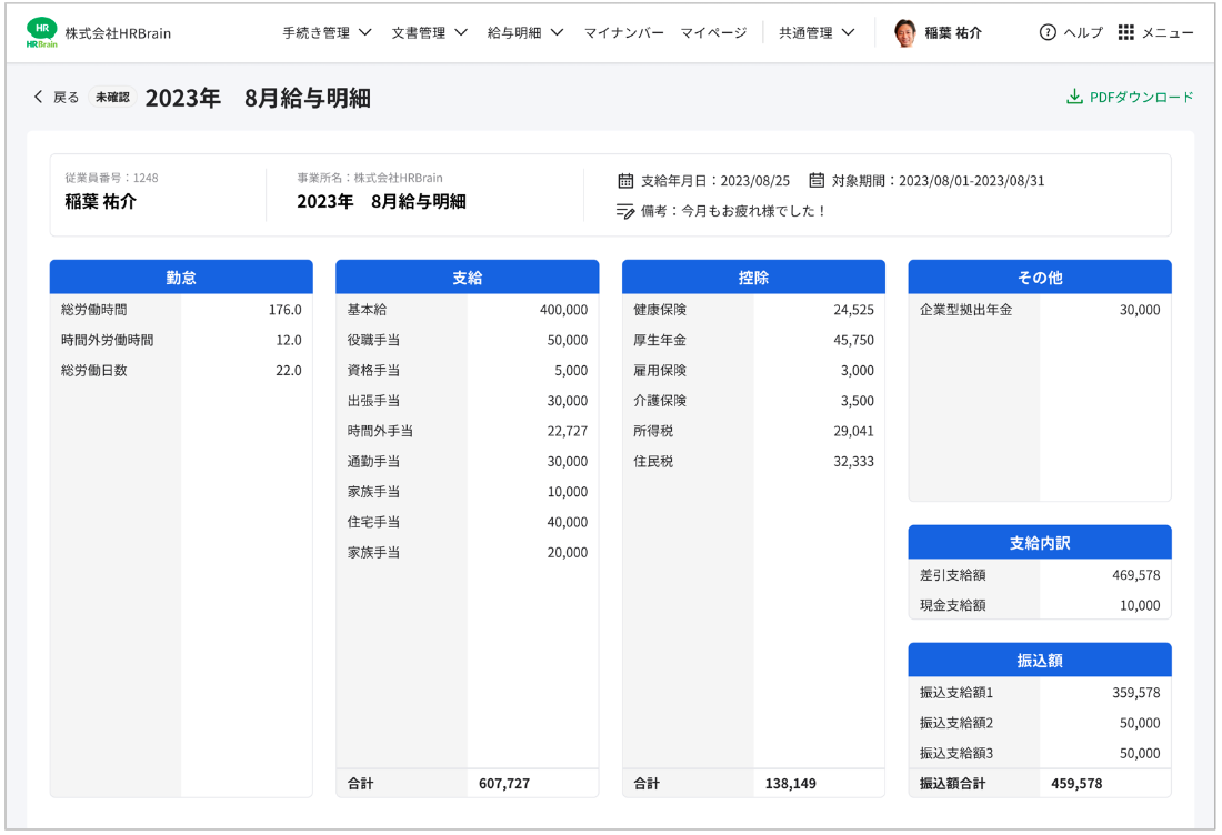 従業員はHRBrainにログインし配布された明細を確認やダウンロードができます。