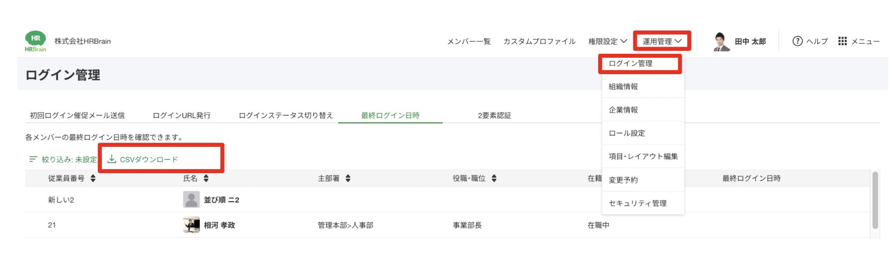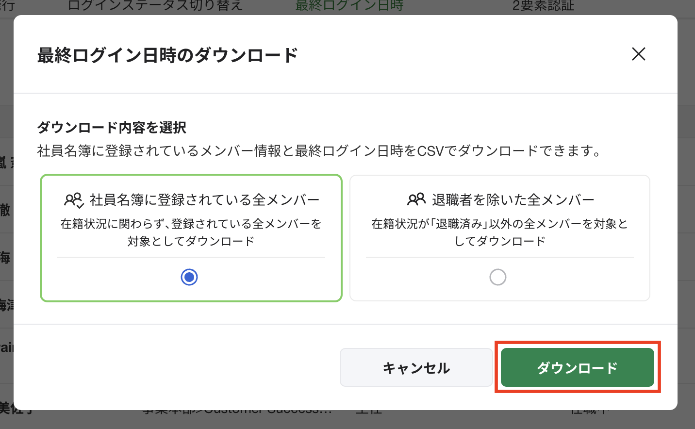 社員名簿に登録されているメンバーの最終ログイン日時をCSVでダウンロードができます。