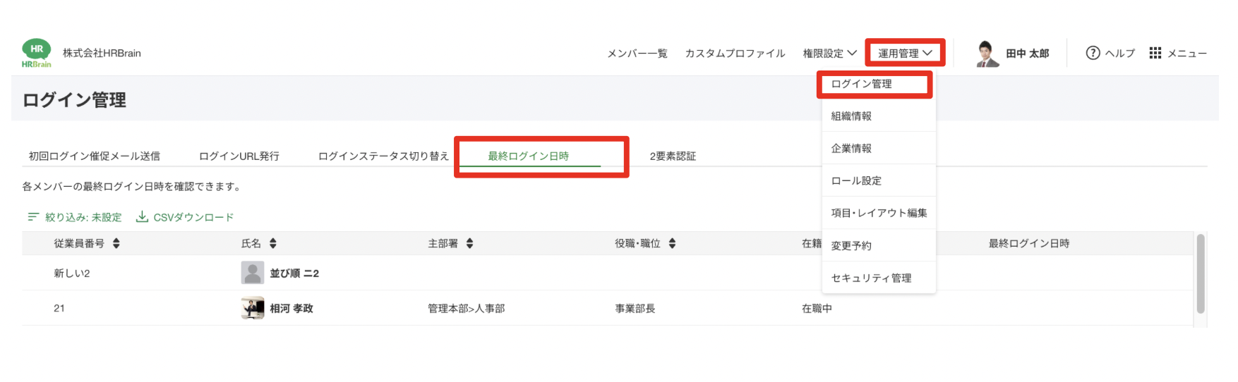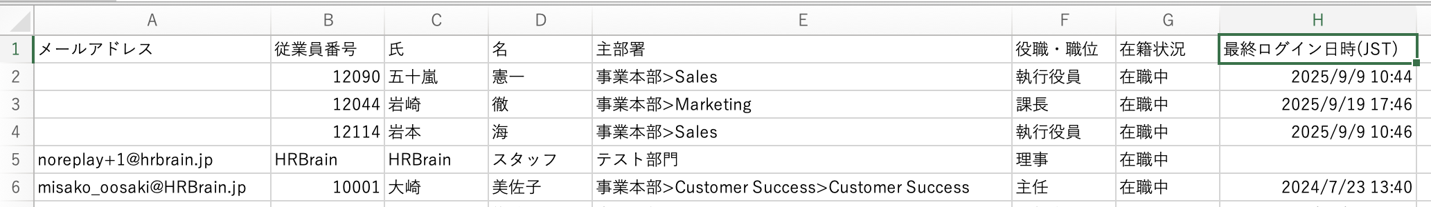 各メンバーがいつHRBrainにログインしたのか、最終ログイン日時を確認できます。