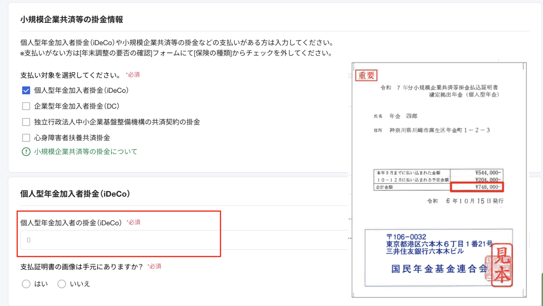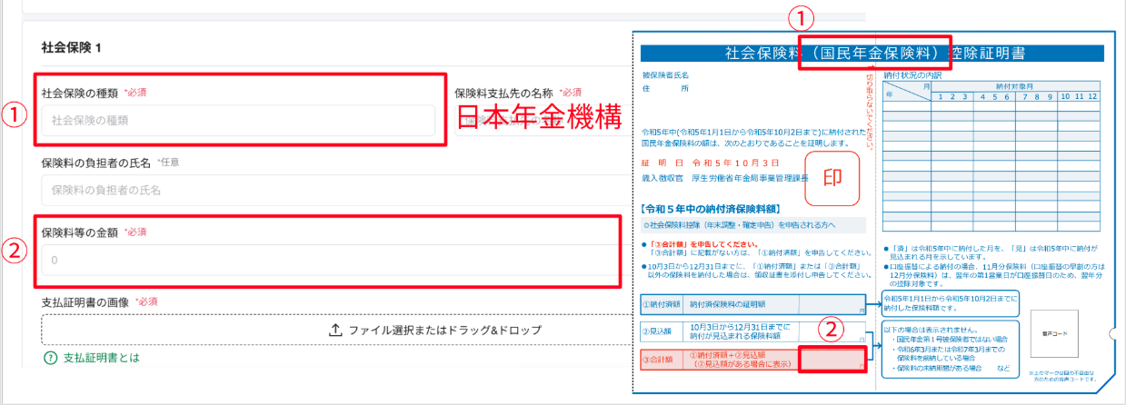 社会保険料(国民年金保険料)控除証明書を例に記載しています。