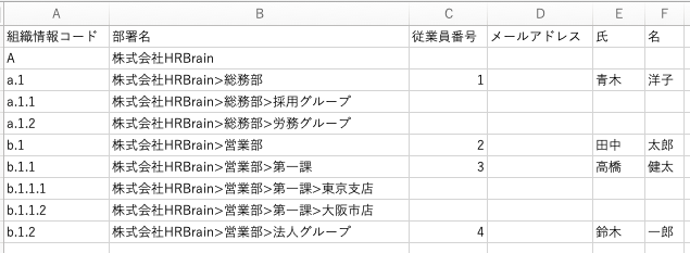 組織上長の一括登録画面でテンプレートをダウンロードして確認してください。