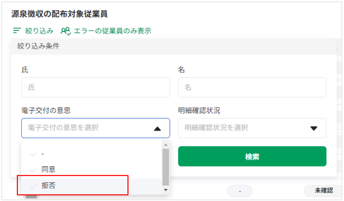 対象の手続きにアクセスし[絞り込み]>[電子交付の意思]>[拒否]>[検索]クリックします。