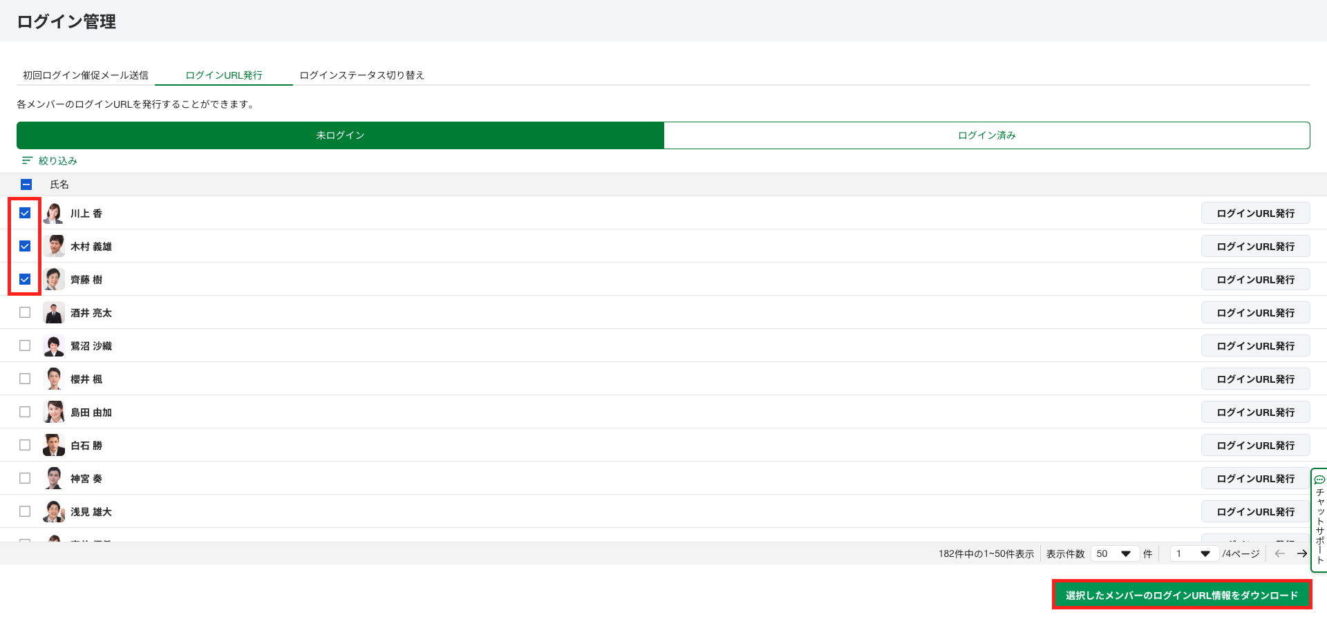 B.[選択したメンバーのログインURLを発行]ボタンをクリック