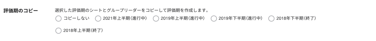 10個以上作成しており、コピー元として使用したい評価期が表示されない場合は、該当の評価期の評価対象期間の開始日を一時的に新しい日時に設定し、表示させてください。
