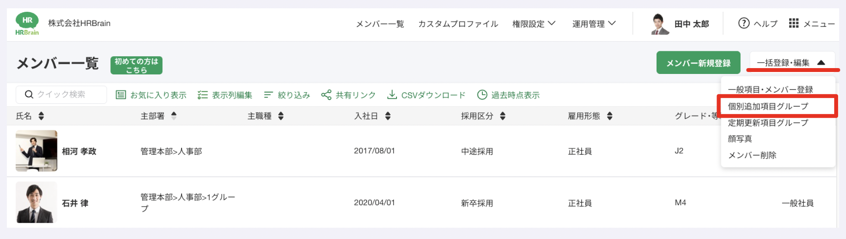 ①[社員名簿] > [メンバー一覧] > [一括登録・編集] > [個別追加項目グループ]をクリックします。