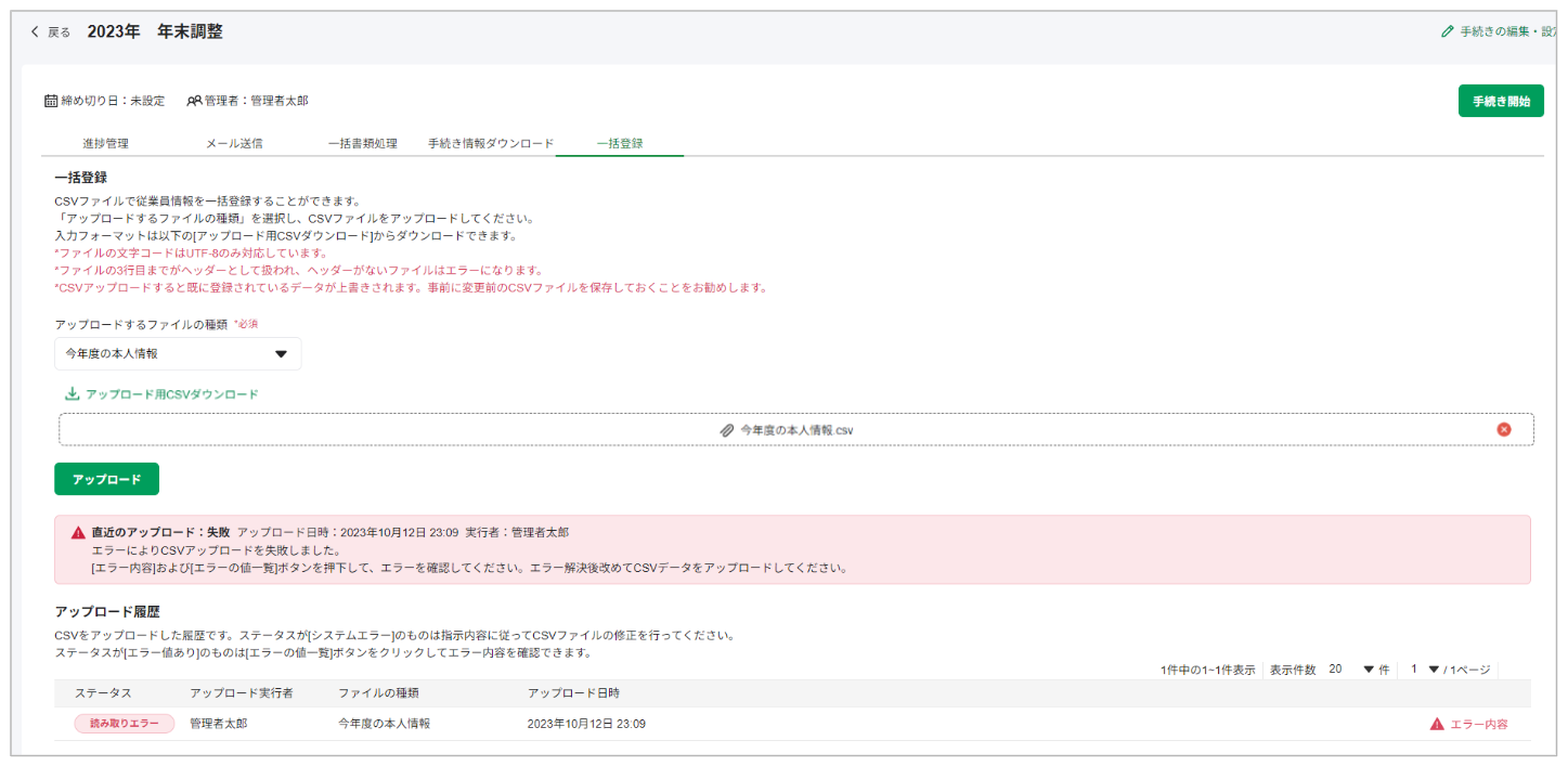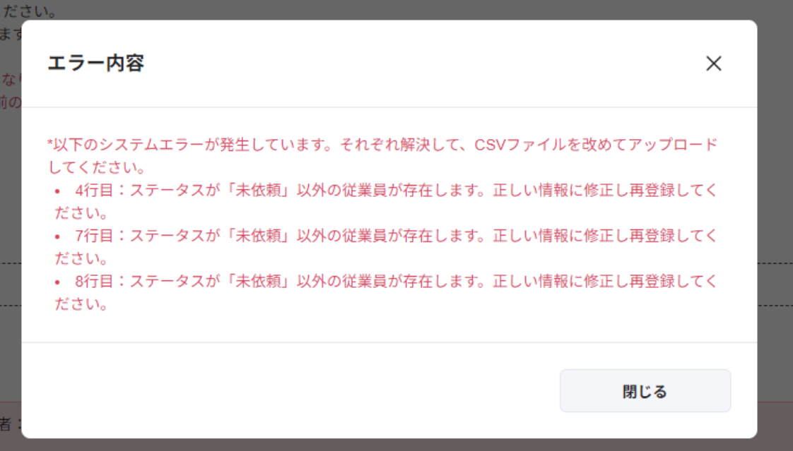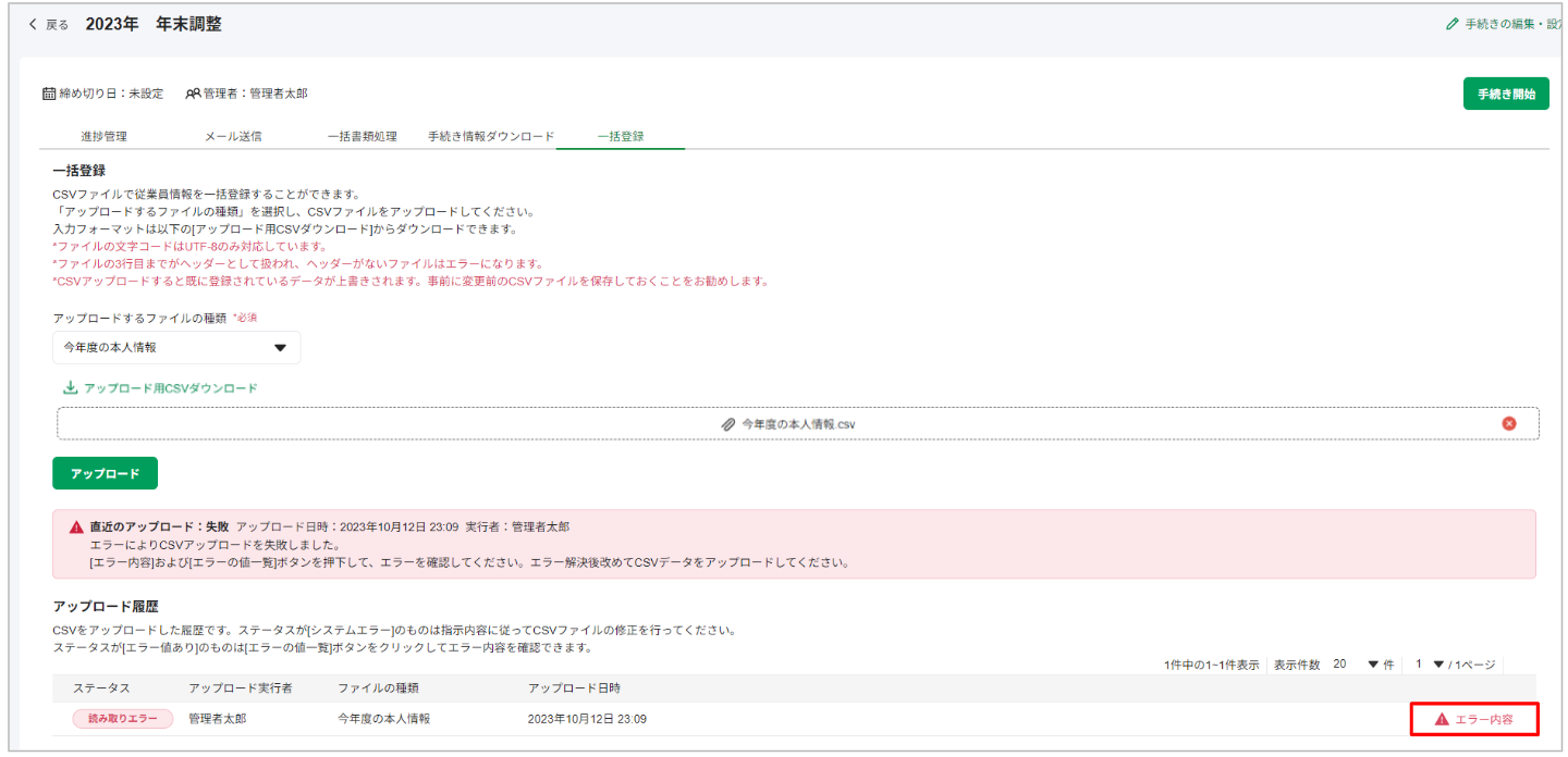 ②読み取りエラーの場合は[エラー内容]をクリックしエラー詳細を確認後、データを修正し再度アップロードを行ってください。