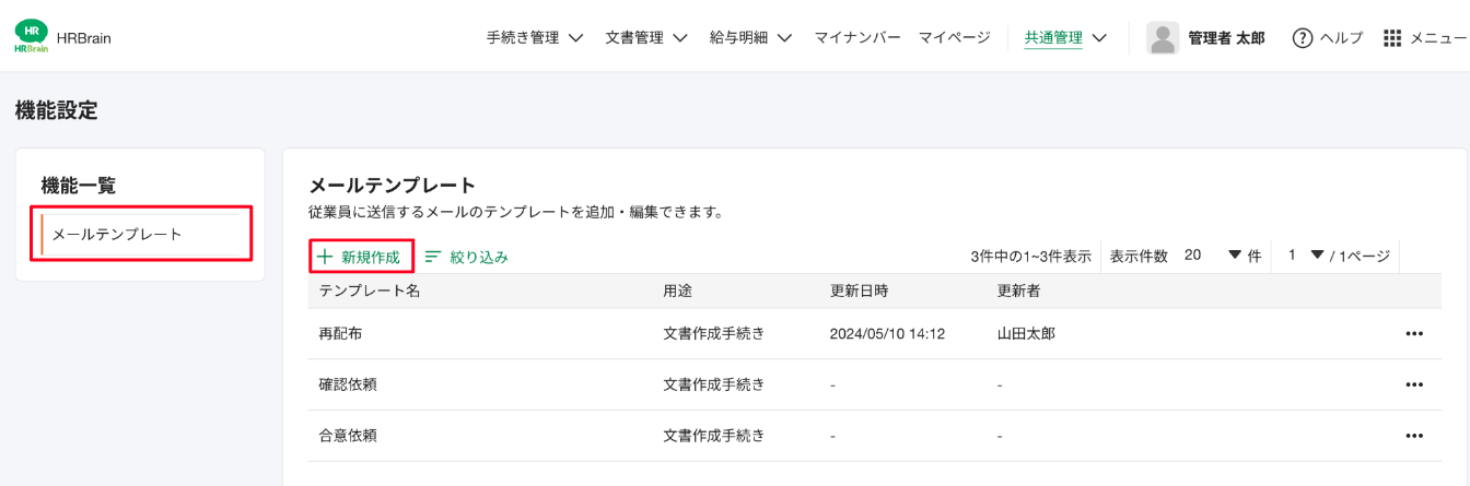 公的手続き、文書作成・電子署名機能にて、従業員に送付するメールのテンプレートを保存できる機能です。