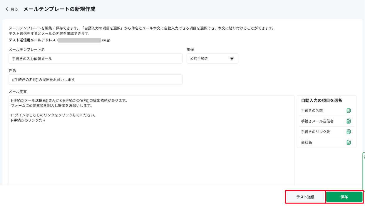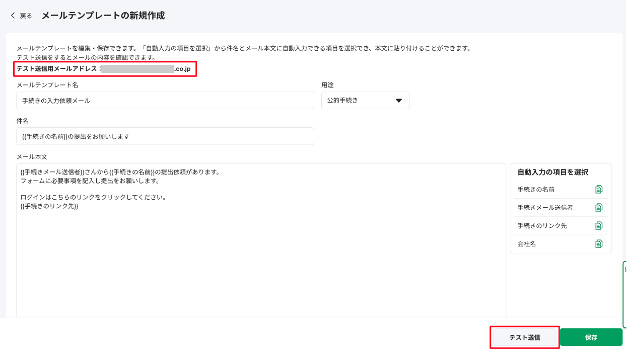 ③編集後、[テスト送信] または [保存]をクリックします
