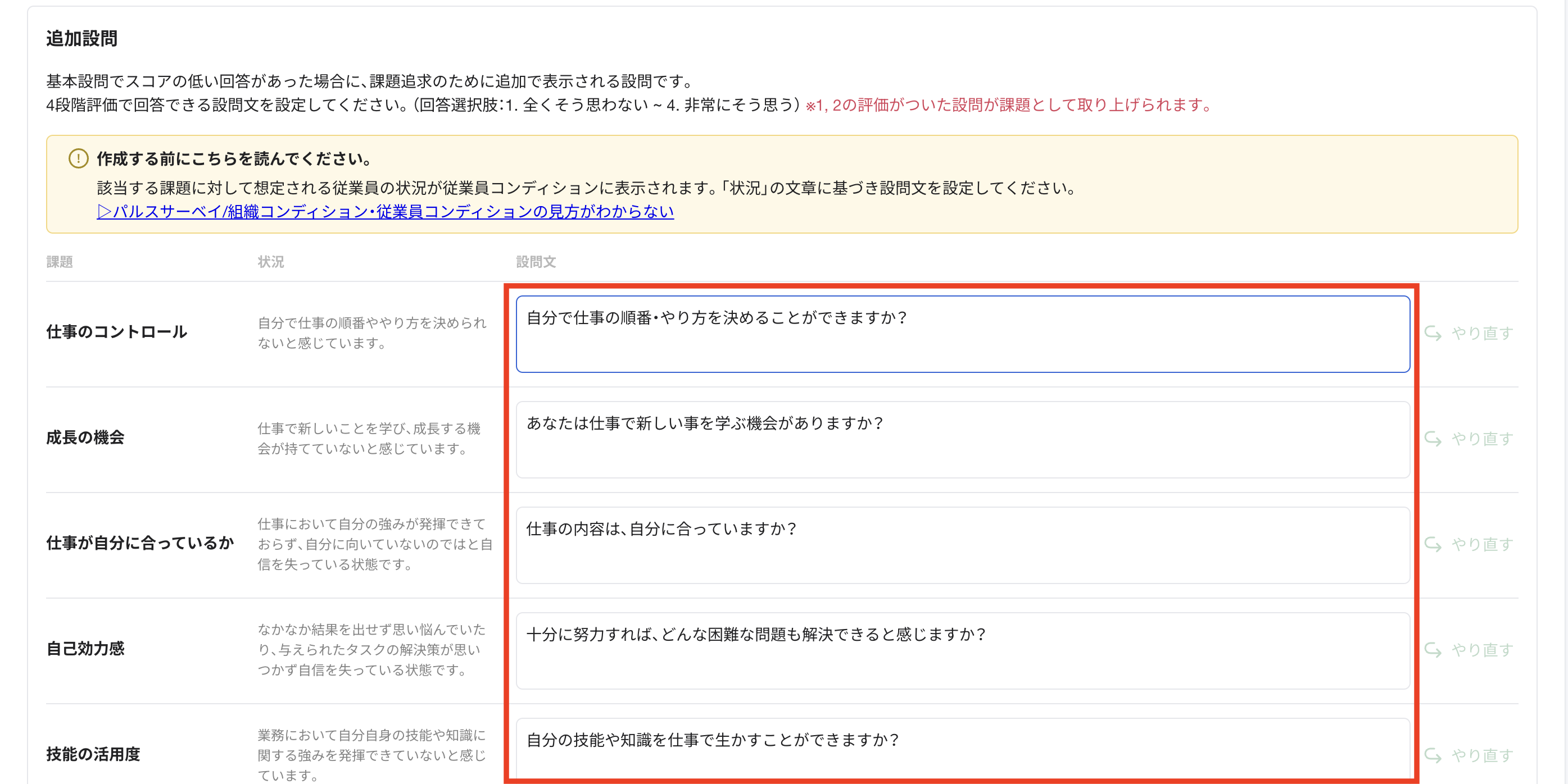 基本設問でスコアの低い回答があった場合に課題追求のために表示される追加設問10問のうち、9つの設問で文章が自由に変更できるようになりました!