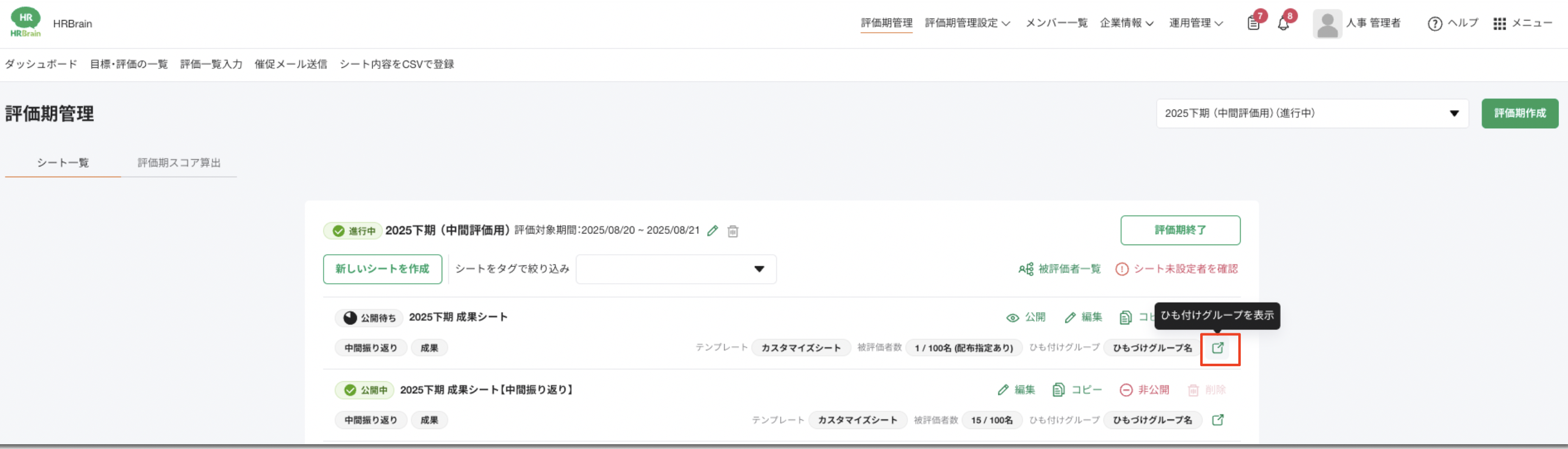 1.[評価期管理]>該当シートの[ひも付けグループ]の右にあるアイコンをクリック。