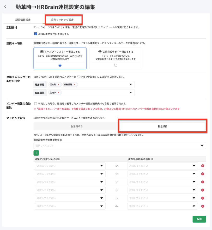 ・勤怠情報のマッピングでは事前にHRBrain内に連携させる定期更新項目グループを作成しておく必要があります。