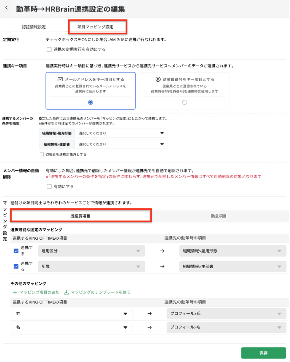 [雇用区分]と[所属]のチェックを外すことで連携しないように設定できます。