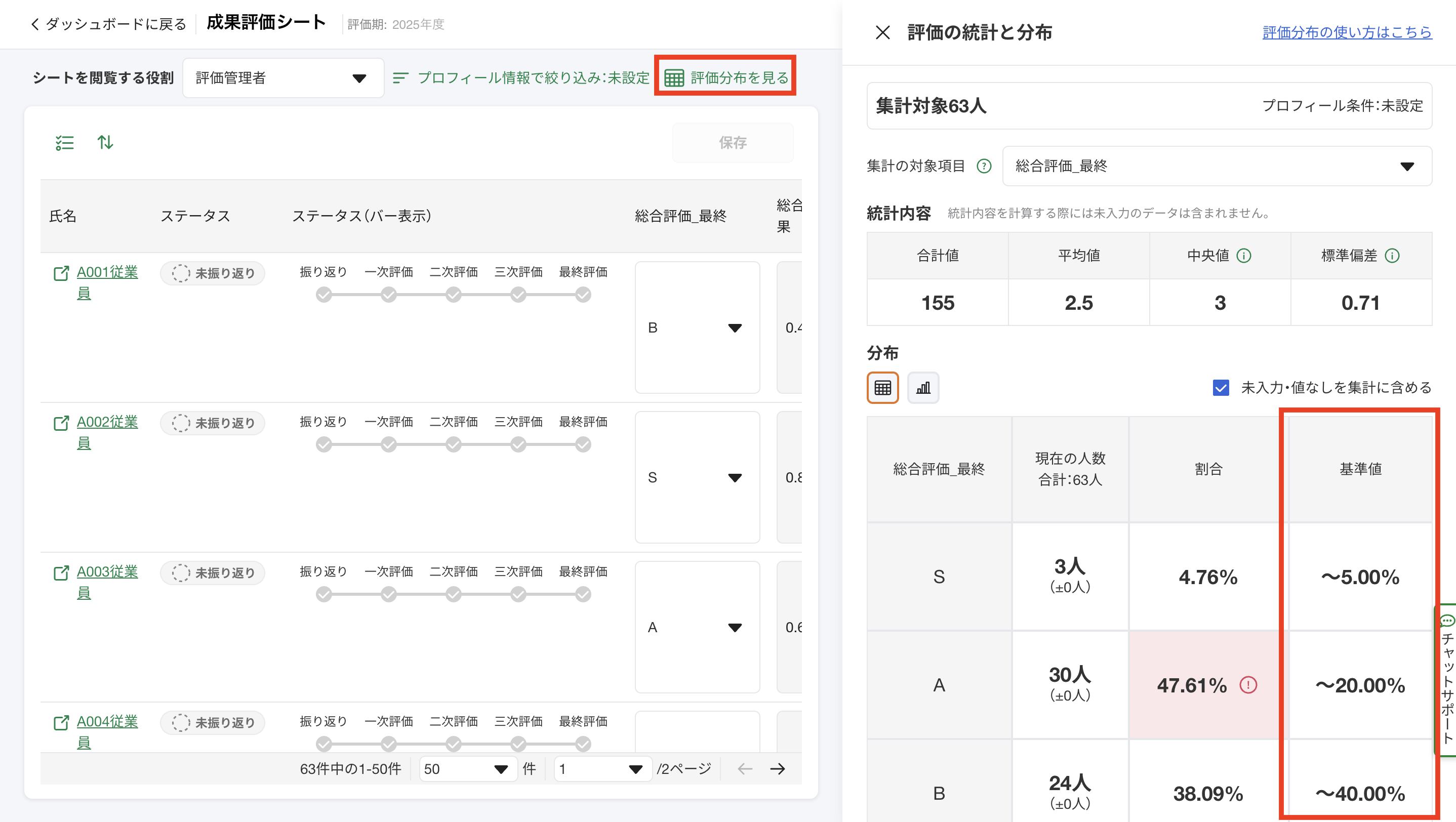 ・一覧に表示されている被評価者が3000人以上の場合は分布表示は使用できません。