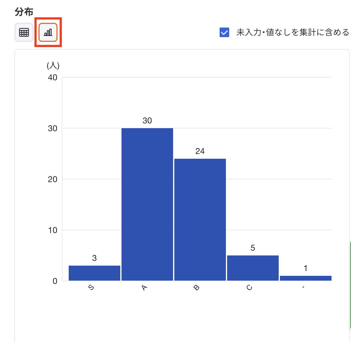 「未入力・値なしを集計に含める」にてチェックを外すと未入力・値なしを集計対象から除外することができます