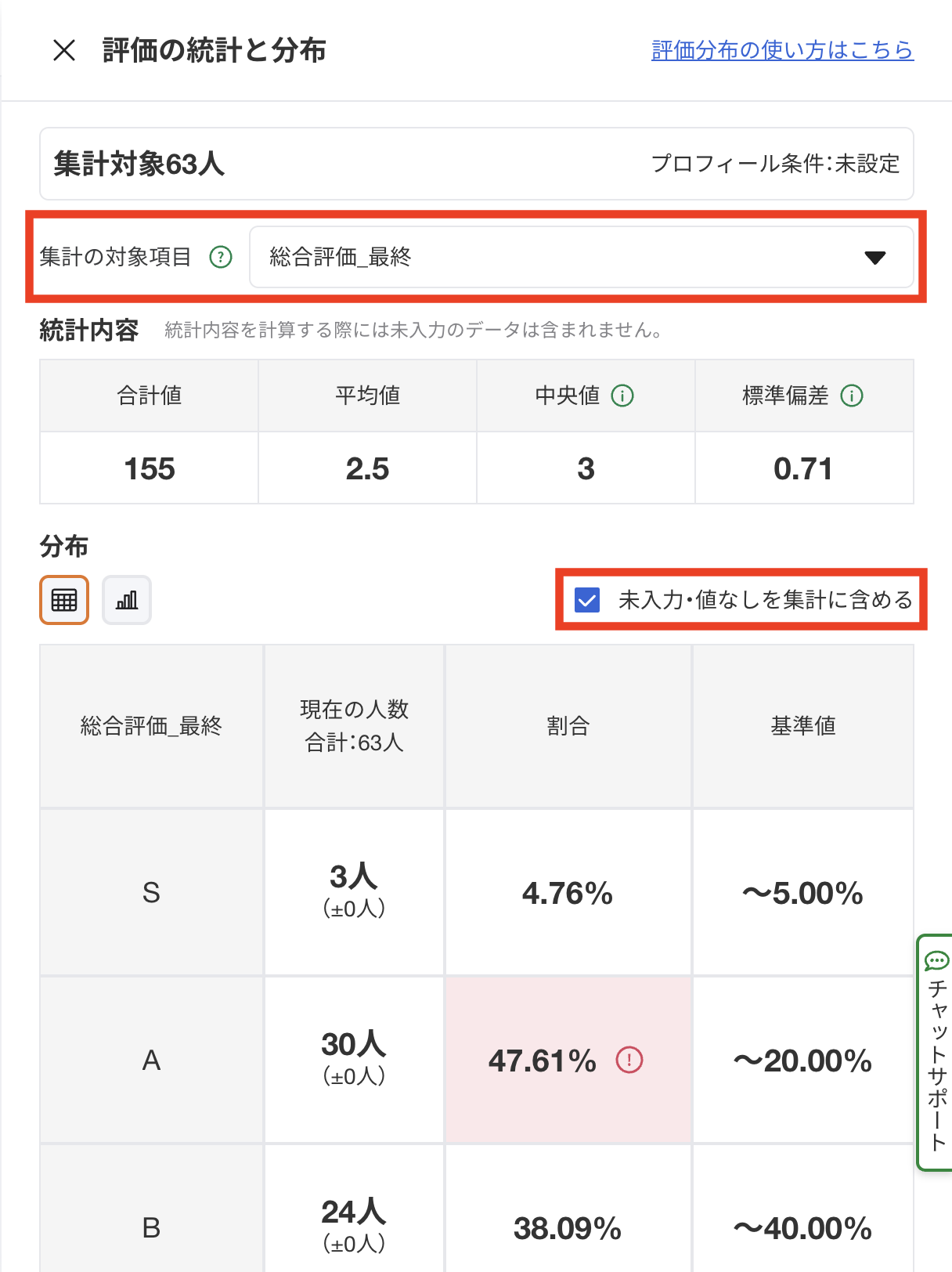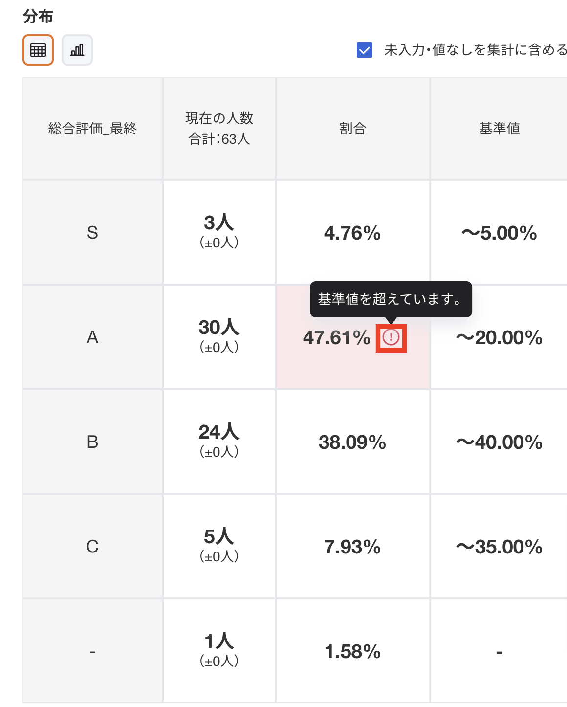 評価分布にて、基準値を超過した場合はアラートが表示されます。