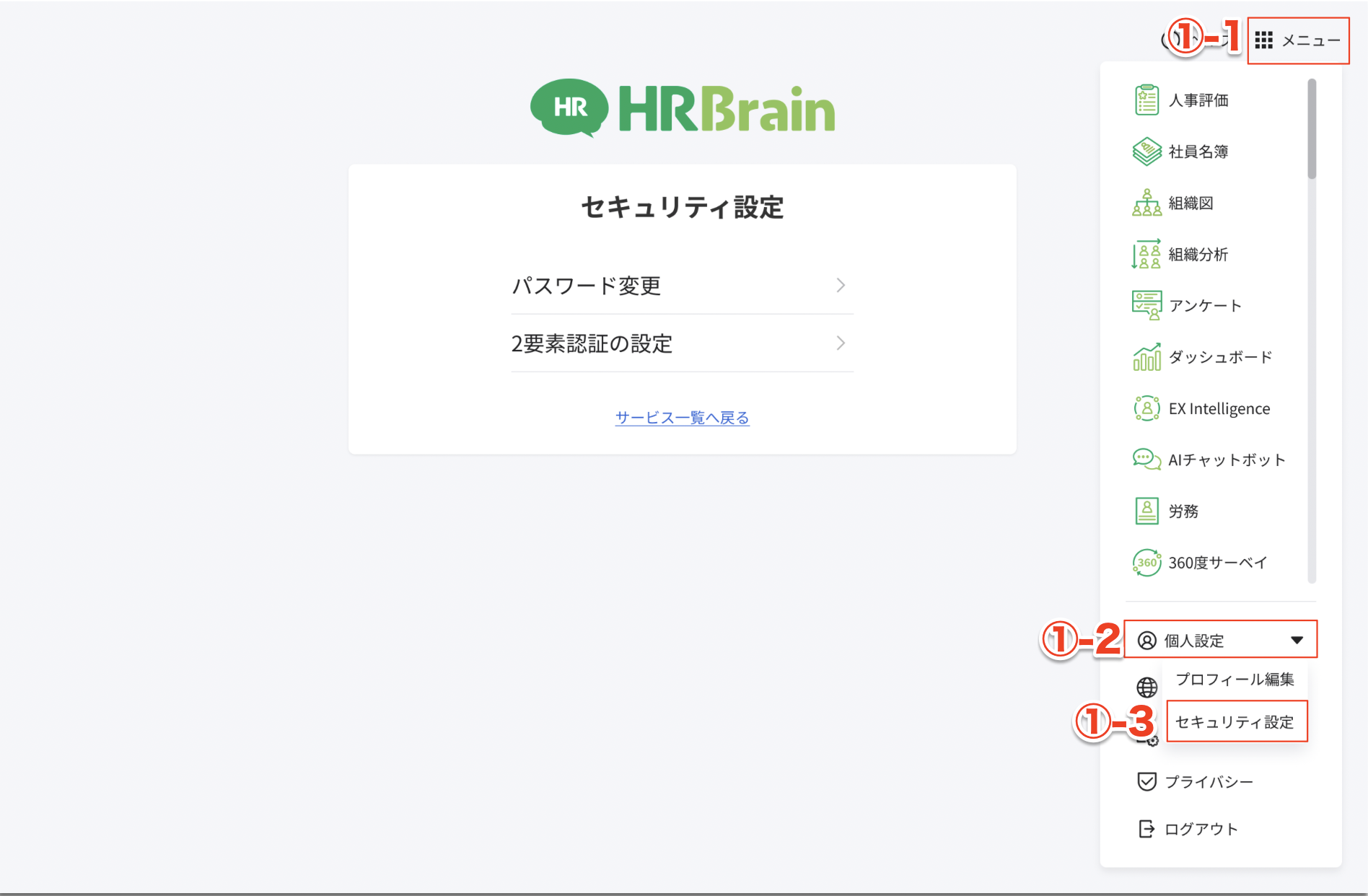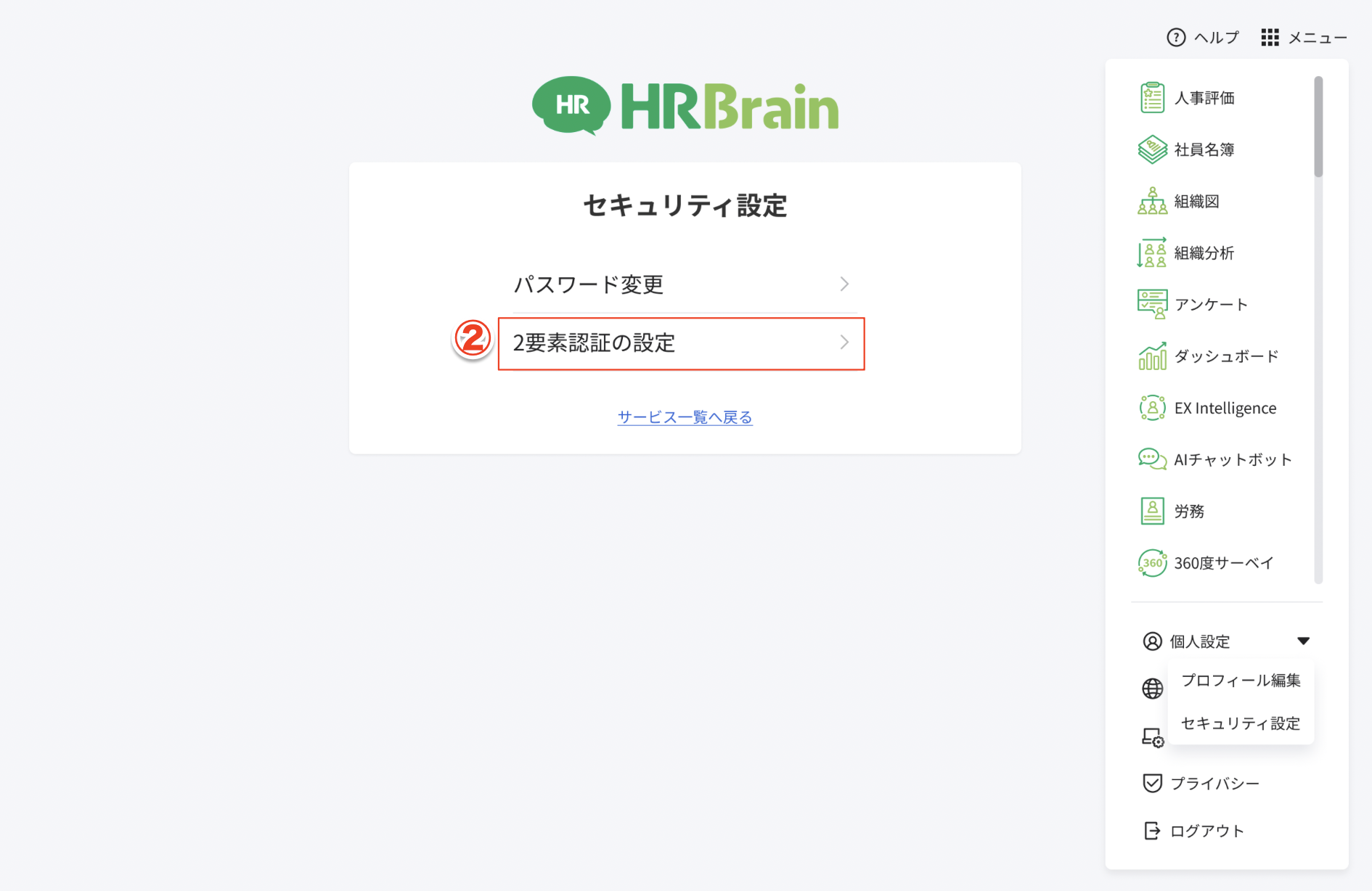 ①画面右上の[メニュー] > [個人設定] > [セキュリティ設定]をクリック
