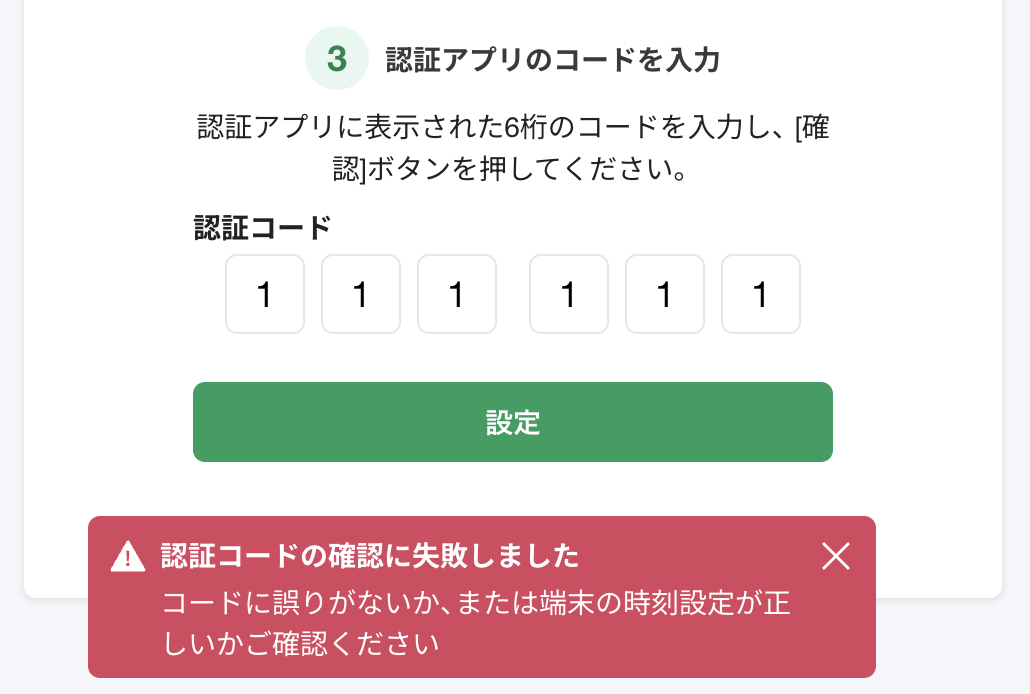 認証コードの確認に失敗しました