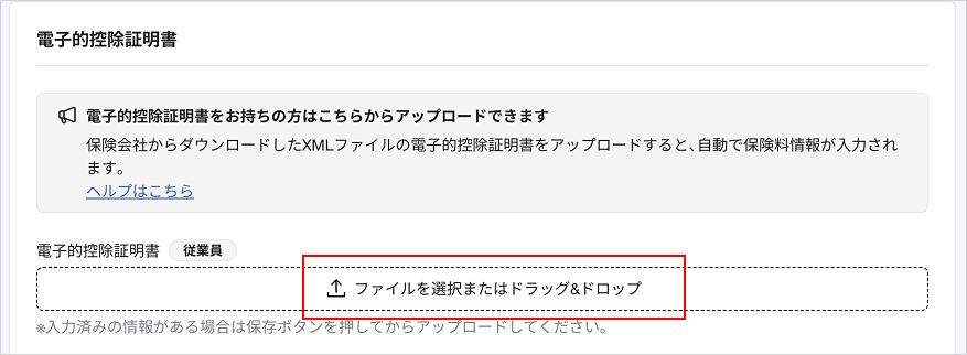 ②[電子的控除証明書]で電子的控除証明書のxmlファイルを選択またはドラッグ&ドロップする。