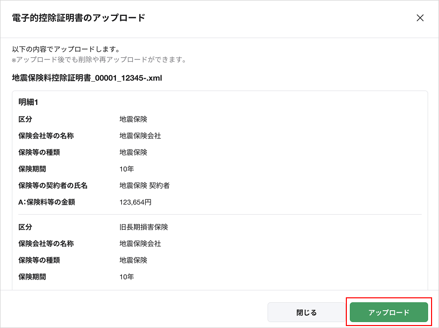 ③アップロードした電子的控除証明書の内容が問題ないことを確認してから[アップロード]を押します。