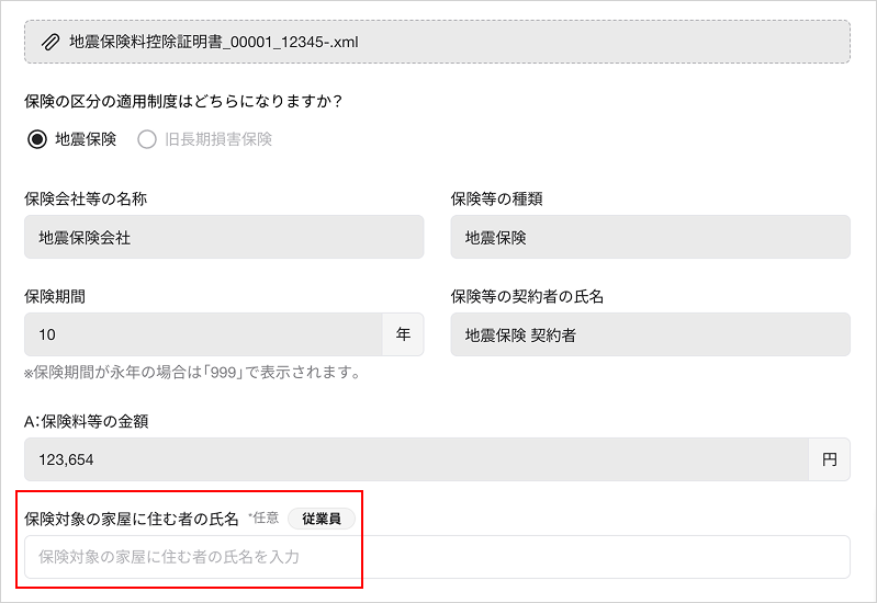 ①アップロードしたい従業員のフォームから、[保険料情報]もしくは[地震保険料情報]を開く。