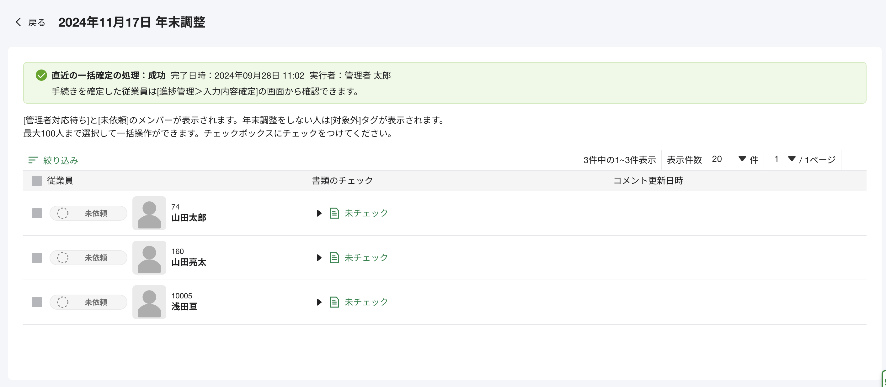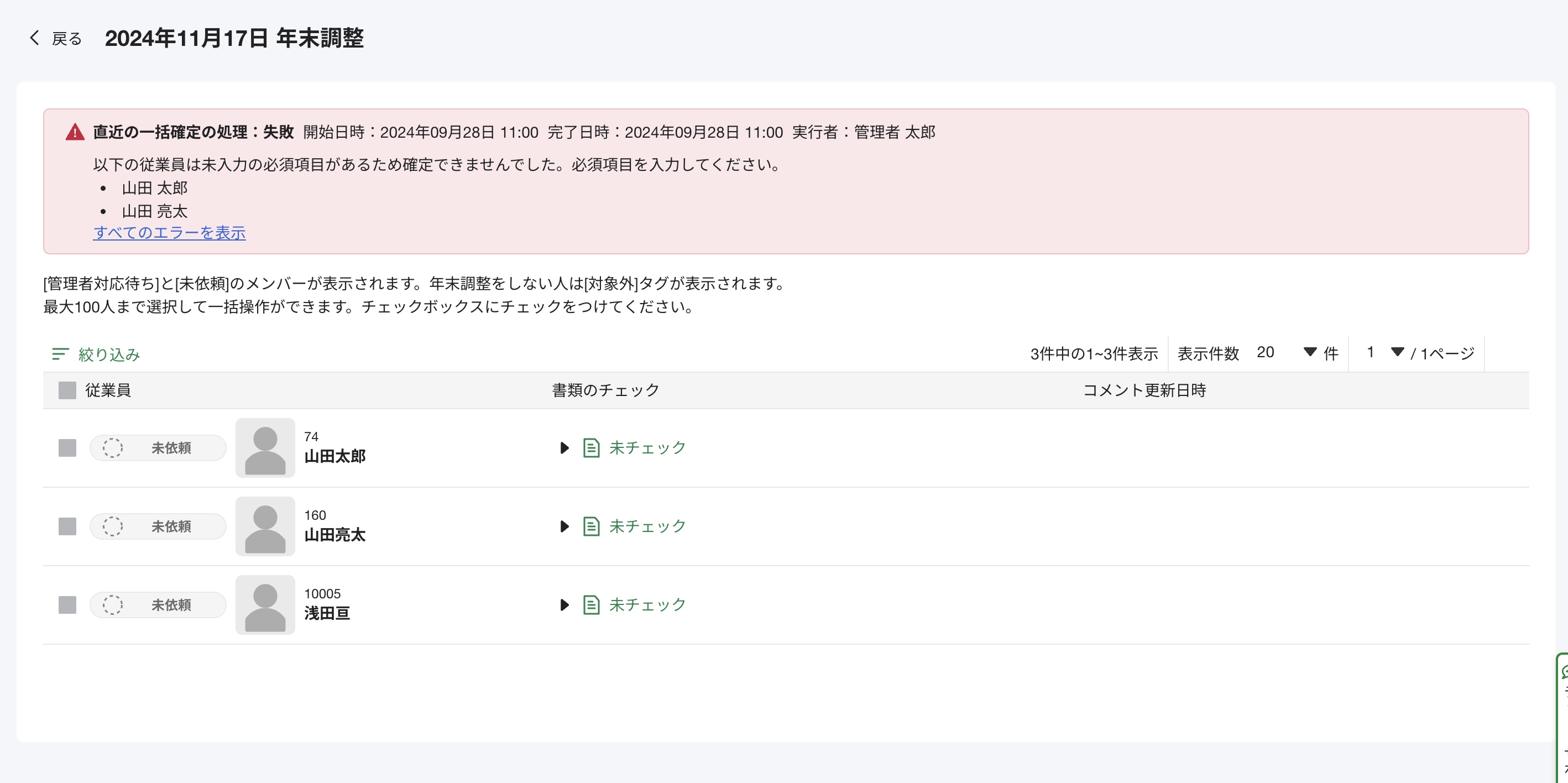 ・一括確定は、確定ボタンを押した時の権限で実行されます。