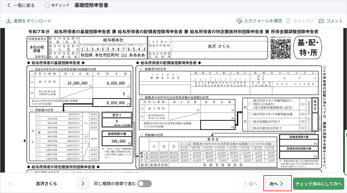 ②[次へ]を押すと、同じ従業員の次の書類を確認できます