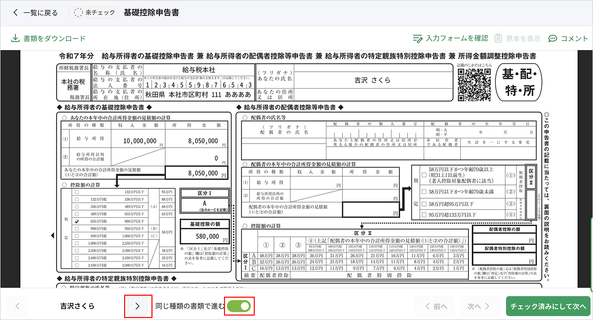 ③[同じ種類の書類で進む]をオンにしてから名前の横の[>]を押すと、次の従業員の同じ書類を確認できます(同じ書類だけを一括で確認することができます)