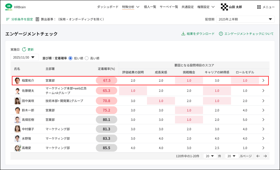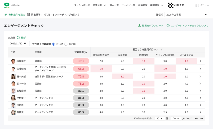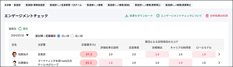 定着確率をもとにして、組織として優先的にフォローすべきメンバーを把握できます。
