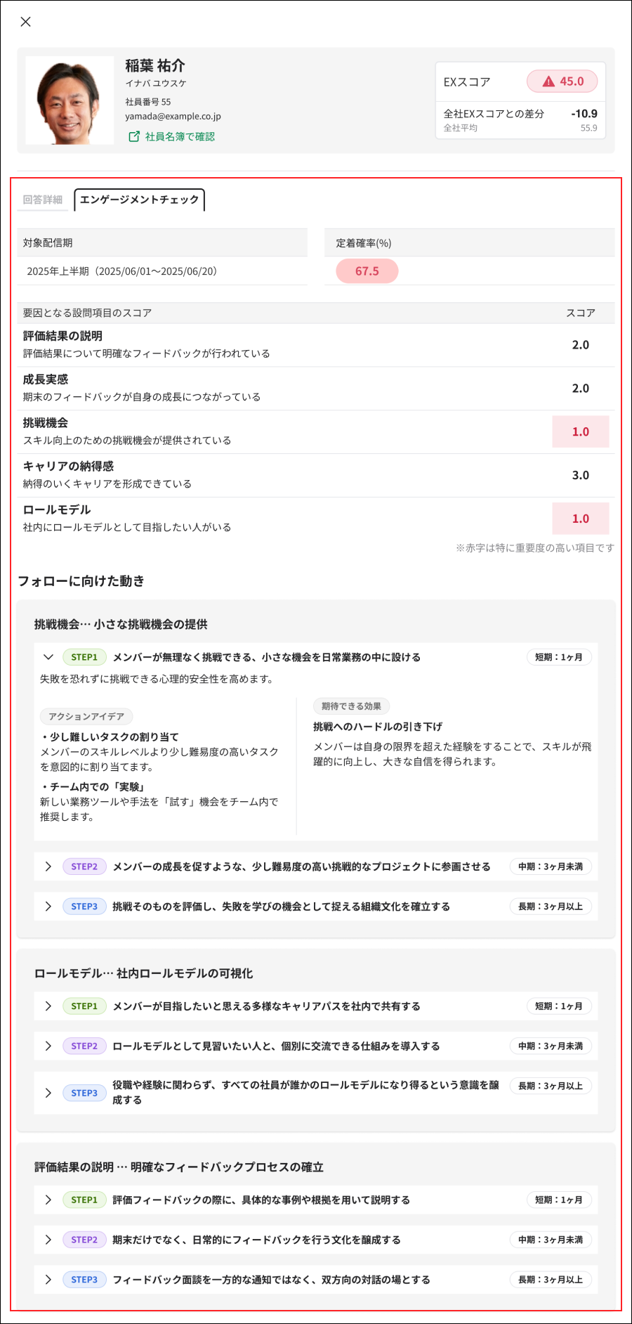 2. 個人の結果と、各メンバーのフォローに向けたアクションプランを確認できます。