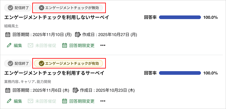 - サーベイ配信時に[エンゲージメントチェックを有効にする]を選択したサーベイ