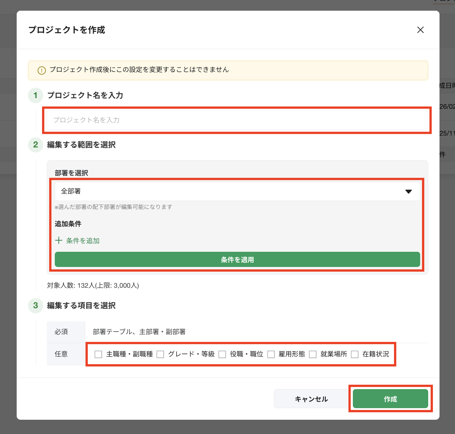 - プロジェクト作成後の対象部署や編集項目は変更できません。