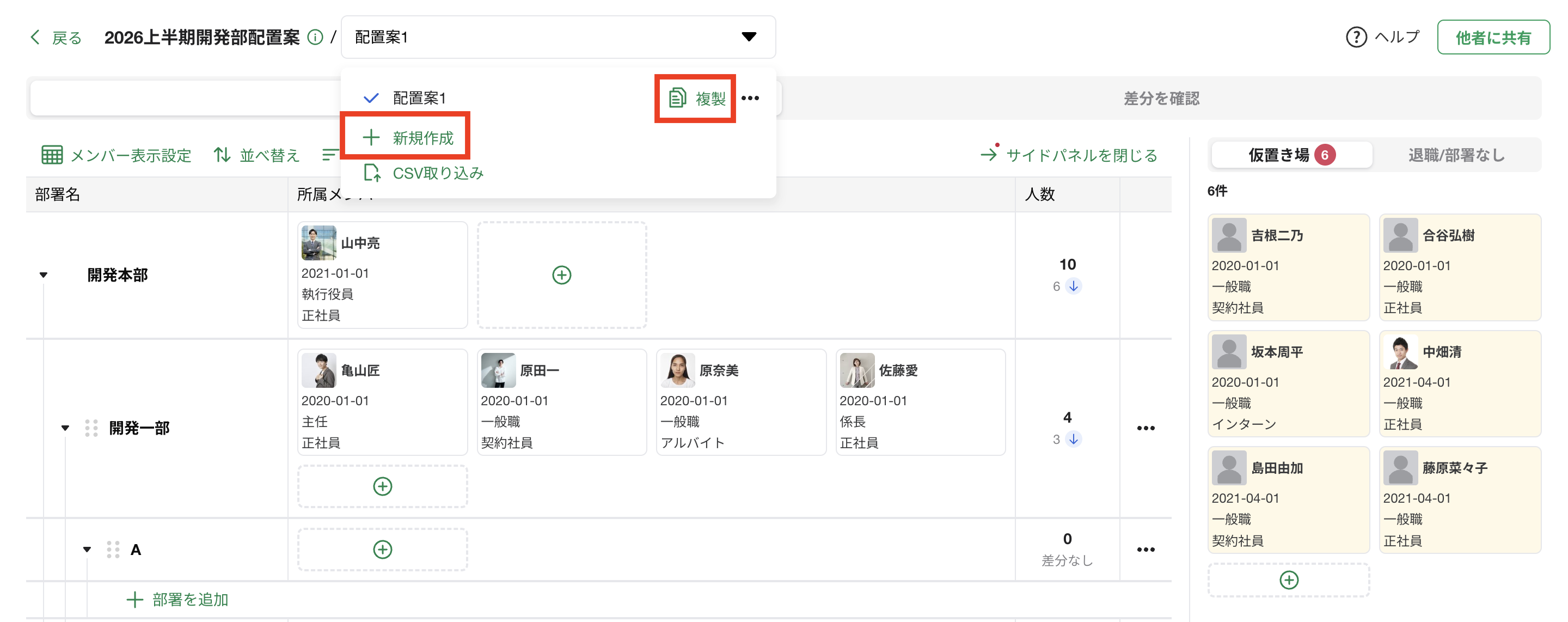 作成された配置案から、組織構造や人員配置を編集してシミュレーションができます。
