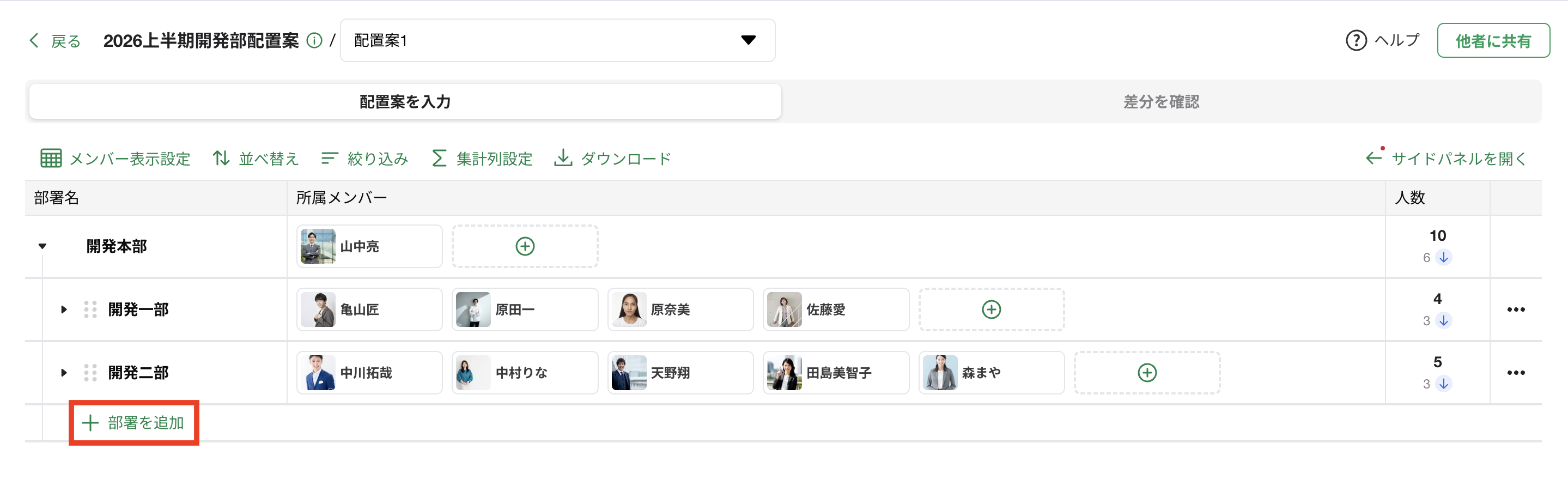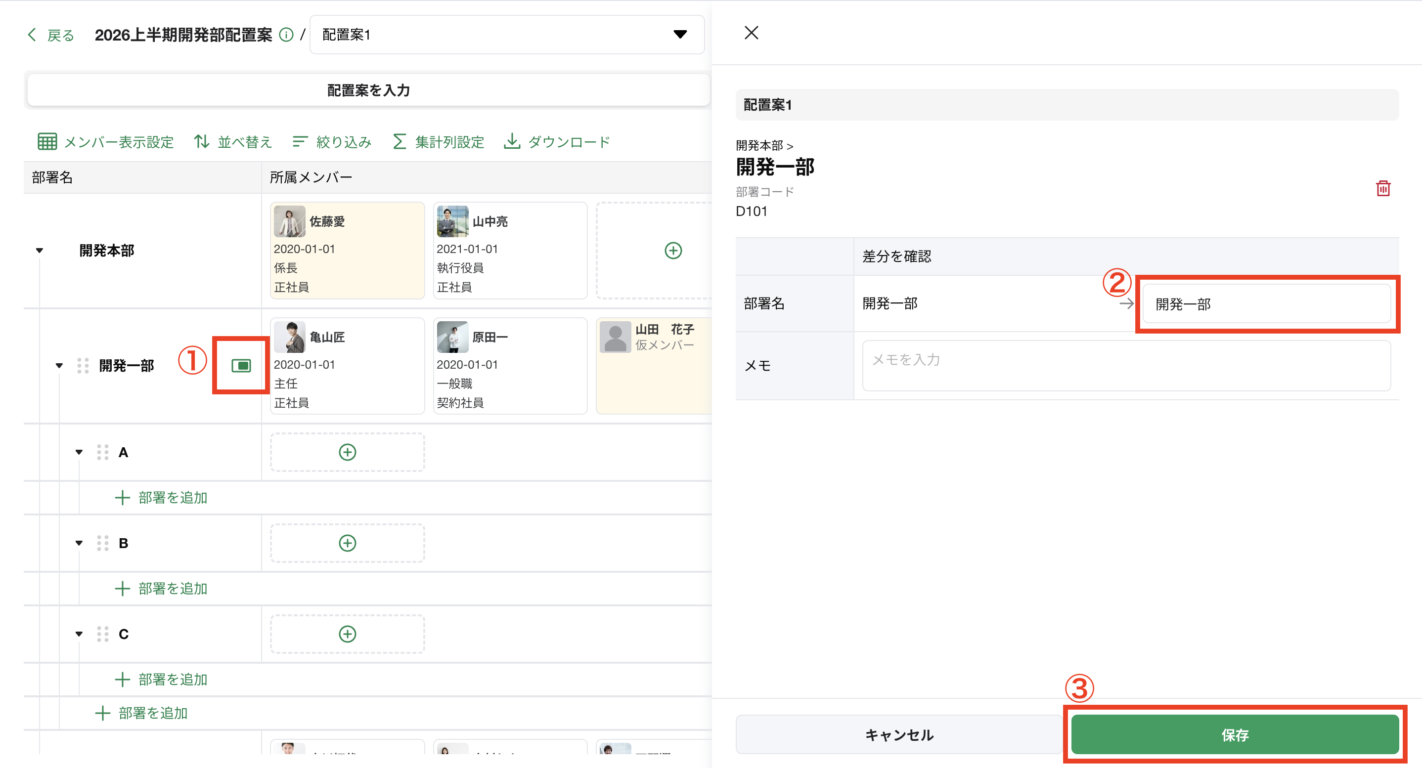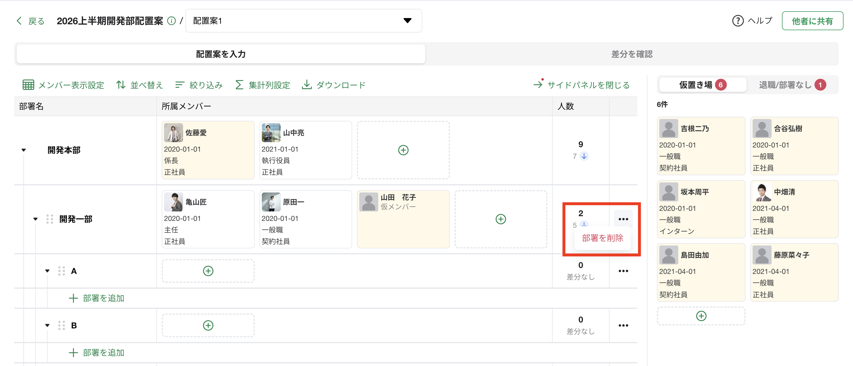 - 部署の削除を行うと、その部署に配置されていたメンバーカードはサイドパネルの「仮置き場」に移動します。