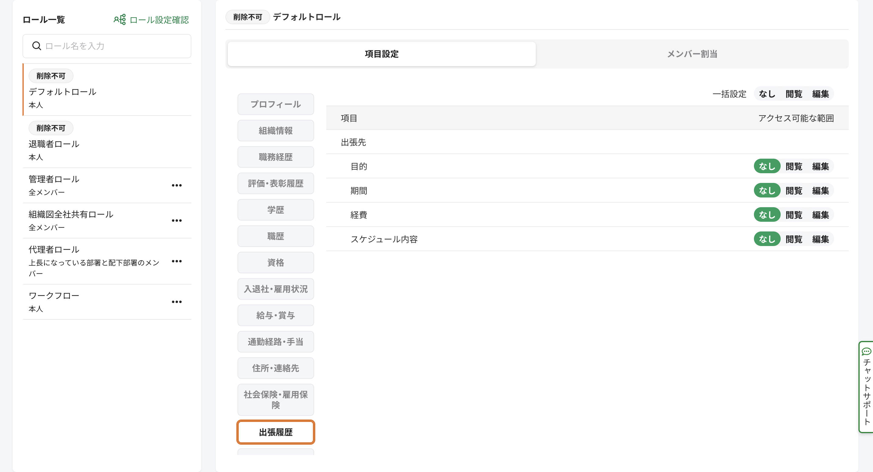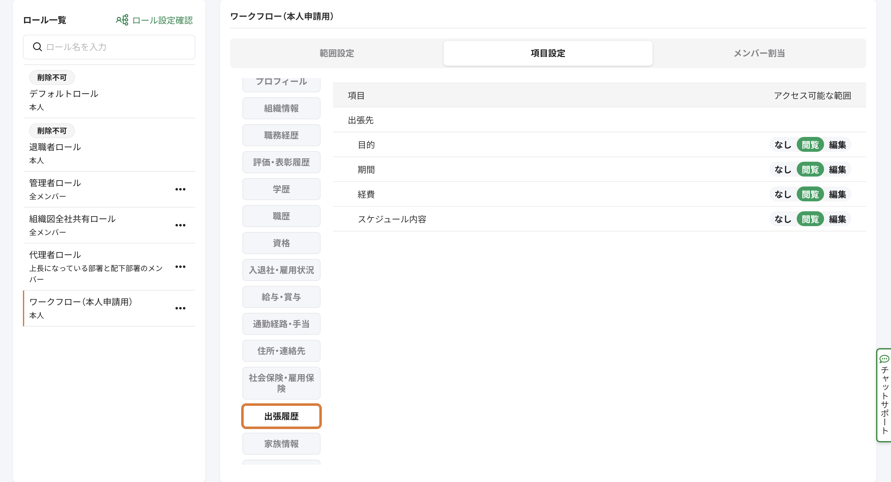 前提として、ワークフローを申請するには社員名簿のロール設定で項目の閲覧権限が必要です。