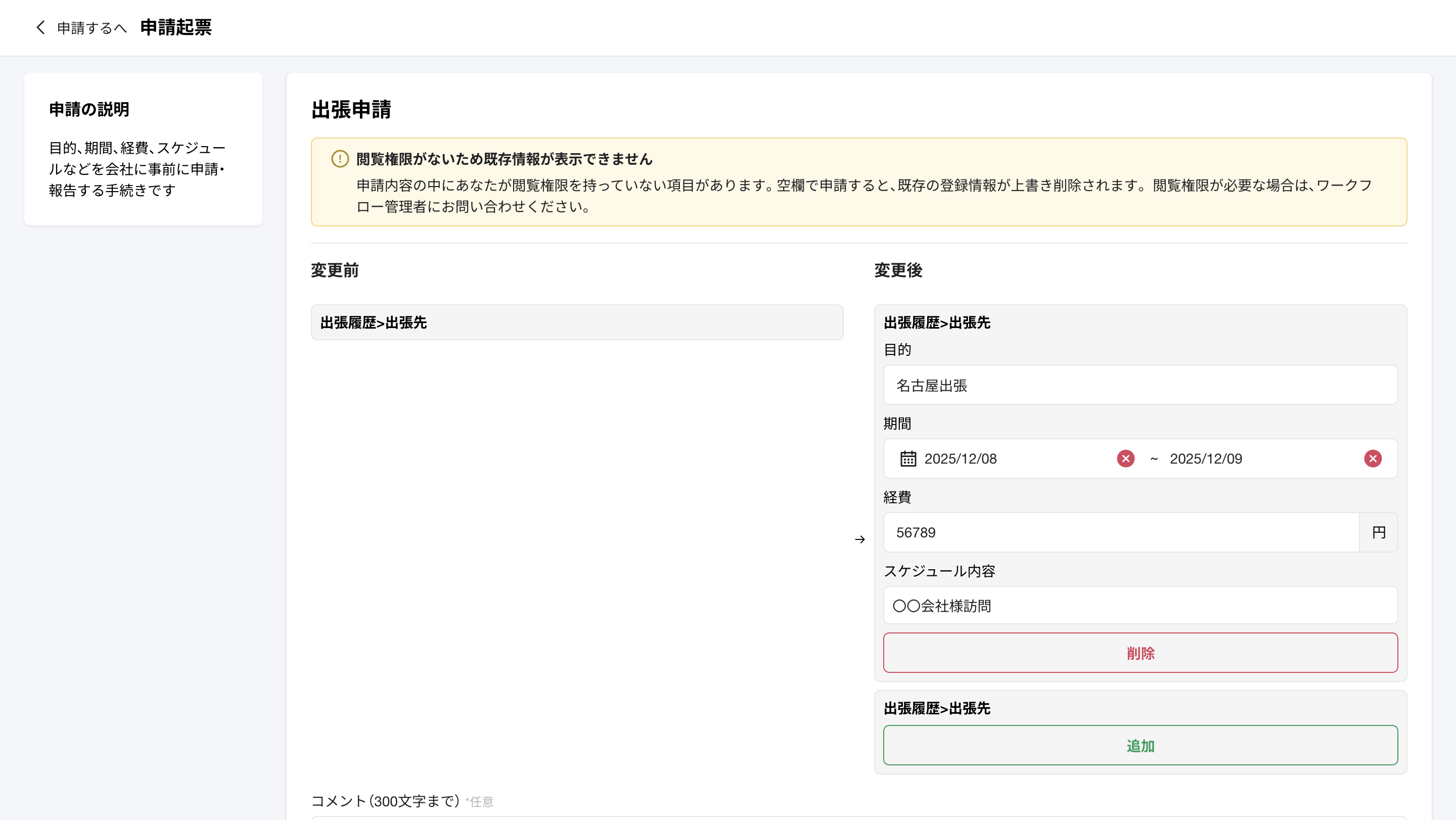- 上記の対処方法を設定した場合、本人の申請画面上では既存情報の閲覧ができないことをお知らせします。